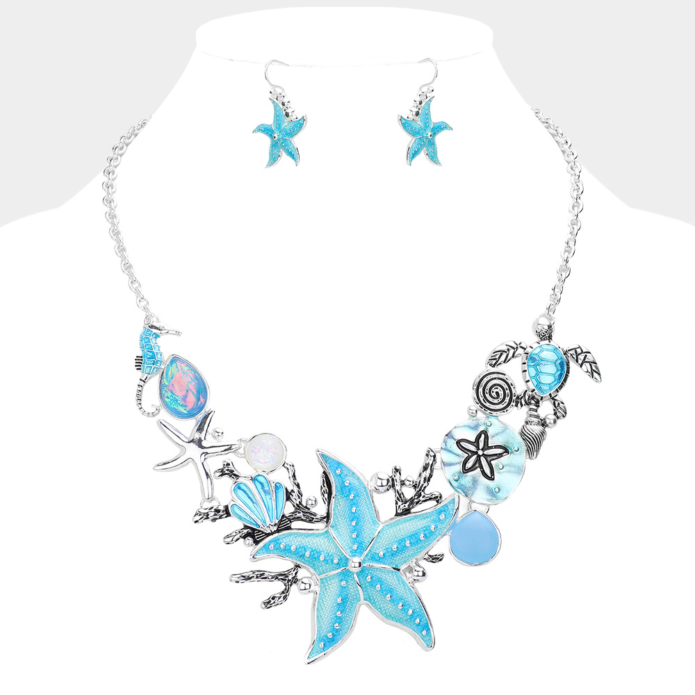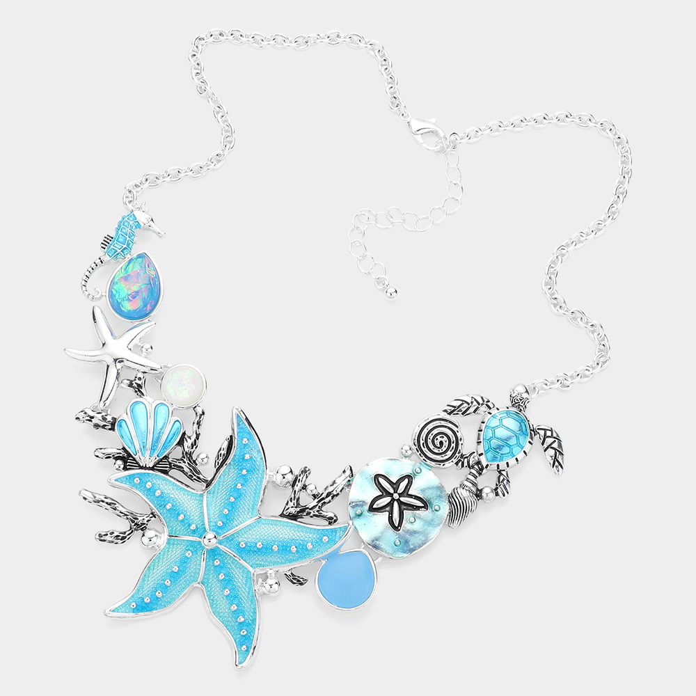 Antique Metal Starfish Sea Turtle Seahorse Shell Sand Dollar Necklace