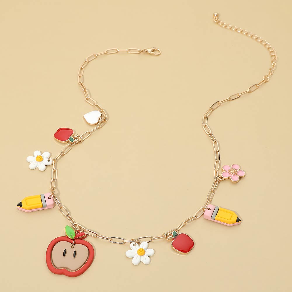 Apple Pencil Flower Charm Station Paperclip Chain Necklace