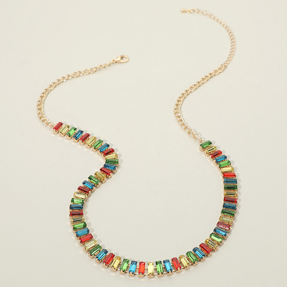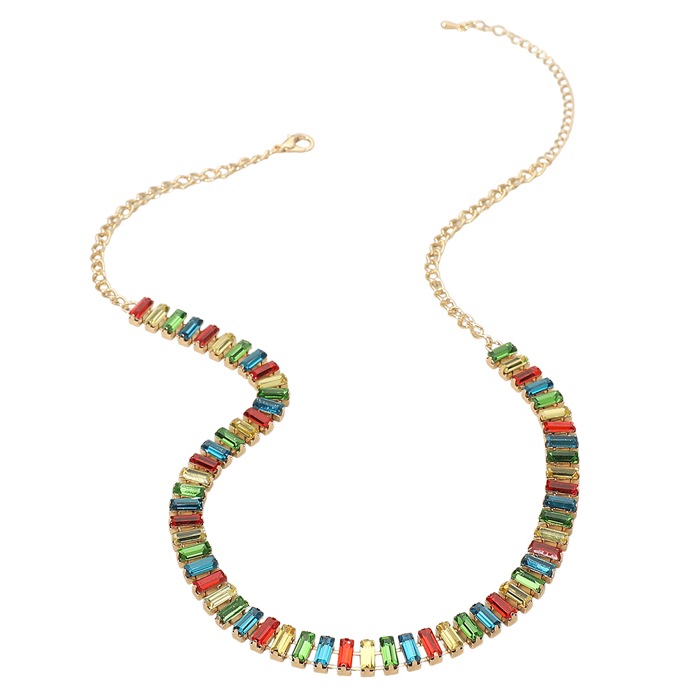 Details • Necklace Size : 18.25" + 3" L • Decor Size : 0.3" L • This statement necklace features a sleek row of baguette style accents arranged along a classic chain for a refined yet eye catching look. Designed to elevate everyday outfits or complete evening styling, it offers a balanced blend of structure and shine. Ideal for layered looks, gift selections, and curated accessory assortments. • Lead and Nickel Compliant