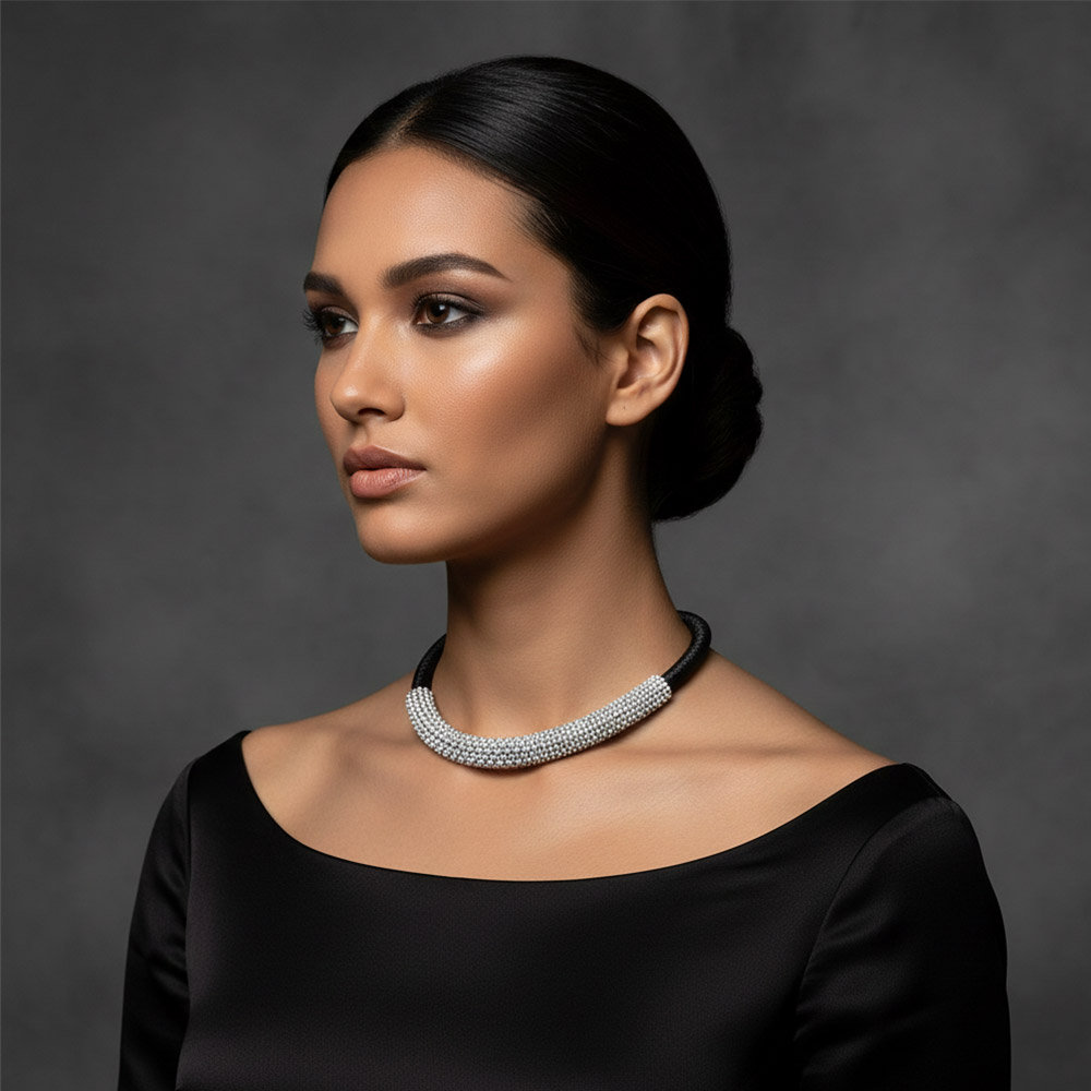Details • Necklace Size : 18.5" L • Decor Size : 0.5" L • Magnetic Closure • Elevate your style with this crystal beaded magnetic necklace. Featuring a textured beaded design with a sleek metallic band and secure magnetic clasp, it offers both elegance and convenience. Perfect for adding sparkle to evening wear or gifting someone special. • Lead and Nickel Compliant