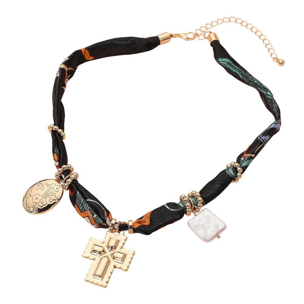 Details • Necklace Size : 16" + 3" L • Decor Size : 1.5" L • Pattern May Vary • Make a bold fashion statement with this Charm Pendant Fabric Necklace, featuring a twisted fabric band accented with shimmering beads, a cross charm, and elegant pendants. Perfect for adding a touch of sophistication and individuality to your casual or evening ensembles. • Lead and Nickel Compliant