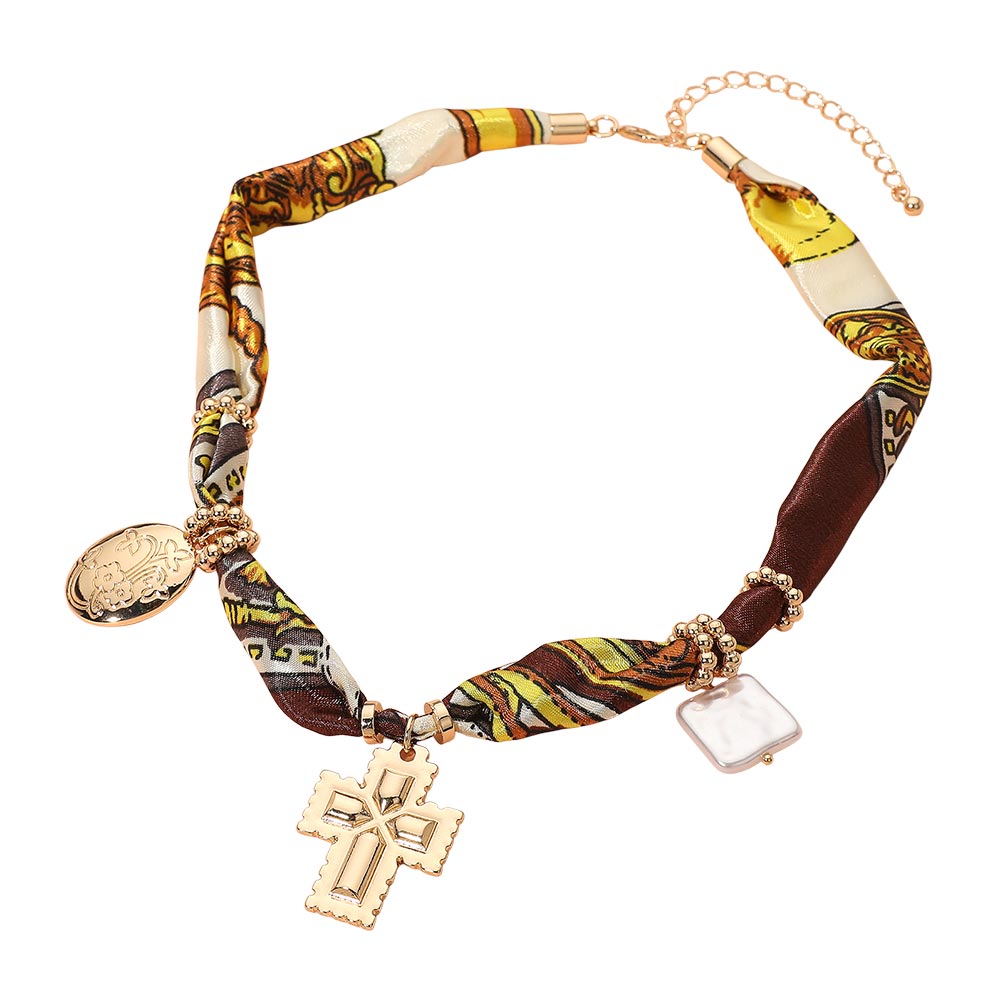 Details • Necklace Size : 16" + 3" L • Decor Size : 1.5" L • Pattern May Vary • Make a bold fashion statement with this Charm Pendant Fabric Necklace, featuring a twisted fabric band accented with shimmering beads, a cross charm, and elegant pendants. Perfect for adding a touch of sophistication and individuality to your casual or evening ensembles. • Lead and Nickel Compliant