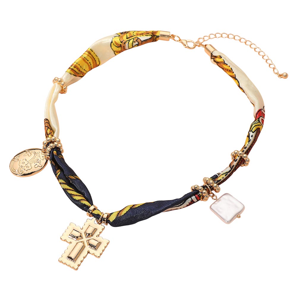 Details • Necklace Size : 16" + 3" L • Decor Size : 1.5" L • Pattern May Vary • Make a bold fashion statement with this Charm Pendant Fabric Necklace, featuring a twisted fabric band accented with shimmering beads, a cross charm, and elegant pendants. Perfect for adding a touch of sophistication and individuality to your casual or evening ensembles. • Lead and Nickel Compliant