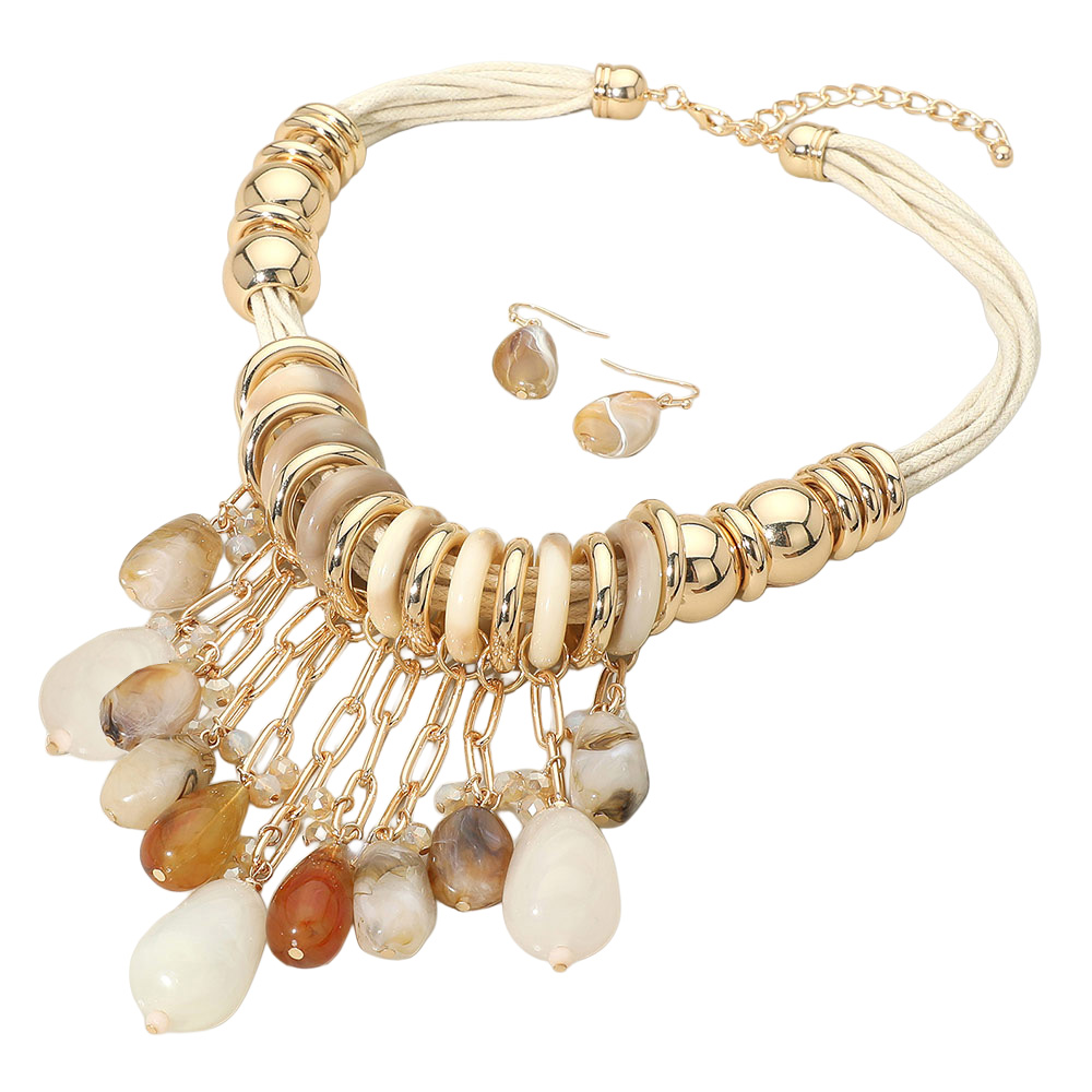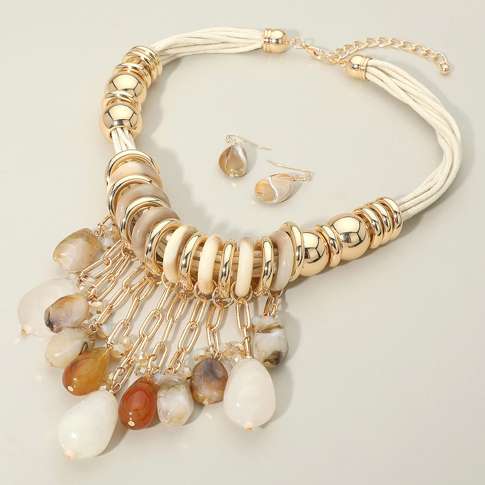 Details • Necklace Size : 18" + 3.25" L • Decor Size : 4.6" L • Earrings Size : 1.25" L • This statement fringe pendant necklace and earring set features a layered design with cascading drop accents and bold dimensional details. Designed to elevate boutique collections, it delivers eye-catching movement and contemporary elegance, making it ideal for fashion styling, special occasions, gifting, and trend-forward accessory displays. • Lead and Nickel Compliant