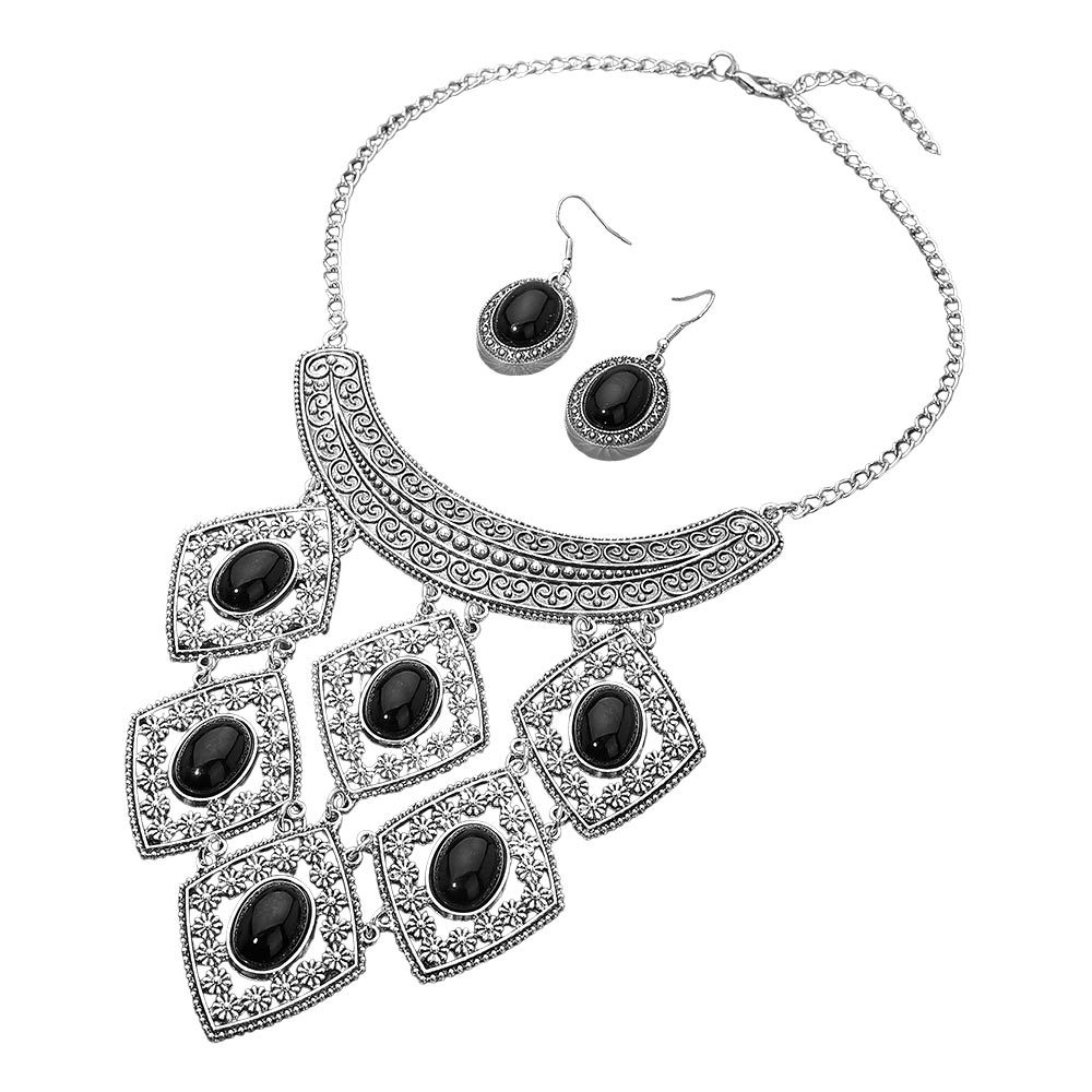 Details • Necklace Size : 17" + 2" L • Decor Size : 5" L • Earrings Size : 1.75" L • Make a bold entrance with this vintage-inspired necklace and matching earrings set featuring intricate metalwork and striking oval accents. Its ornate layered design adds dramatic flair to evening looks, special occasions, and standout outfits, delivering unmistakable statement style. • Lead and Nickel Compliant