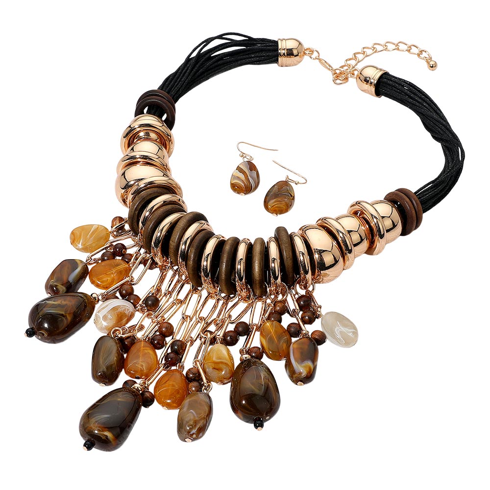 • Elevate your style with this layered bead necklace and earring set featuring sculpted rings, polished details, and cascading charms. Its dramatic mix of shapes and textures adds artistic depth and movement, creating a striking statement piece perfect for standout everyday looks or special occasions.