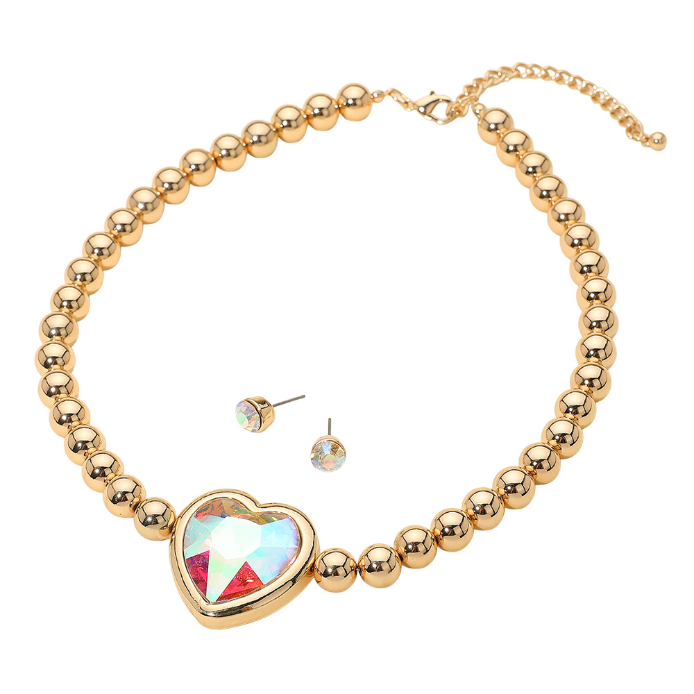 Details • Necklace Size : 17.5" + 3" L • Decor Size : 1.5" L • Earrings Size : 0.3" L • Brighten your look with this stunning beaded necklace and matching crystal stud earrings. A radiant heart pendant creates a bold, eye-catching centerpiece, while polished beads add a sleek, elegant finish. Perfect for parties, special occasions, or adding a playful sparkle to everyday style. • Lead and Nickel Compliant