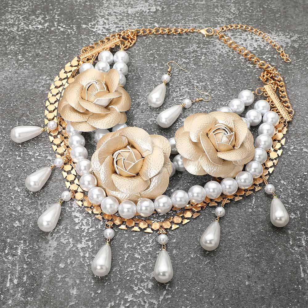 • A striking statement set featuring layered beads, sculpted floral accents, and elegant drop details. Its dramatic silhouette enhances any special-occasion look, offering a refined and artistic accessory with timeless appeal.