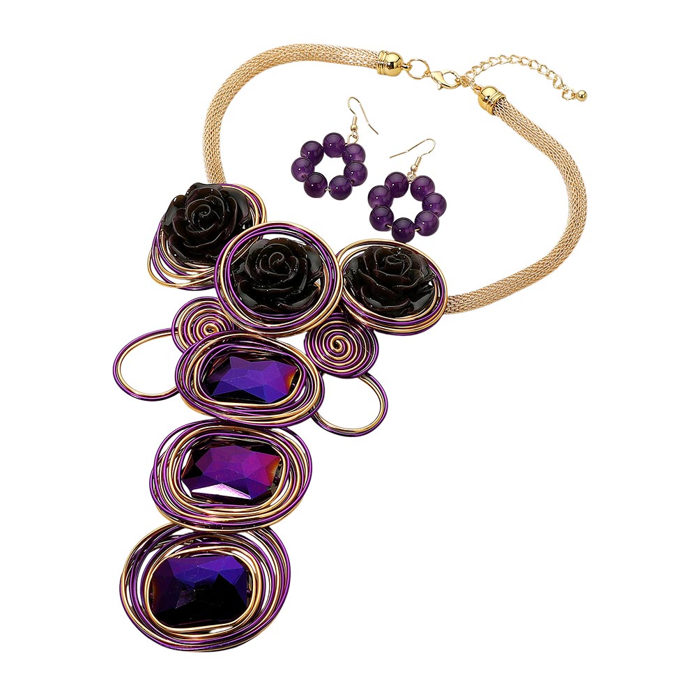 • This bold statement necklace and earring set showcases an artistic blend of floral motifs and faceted gem accents. Designed to stand out, it adds dramatic elegance and creative flair to any outfit, making it the perfect accessory for special events or evening glamour.