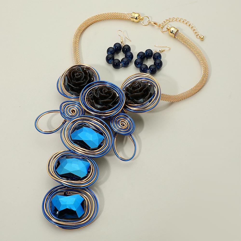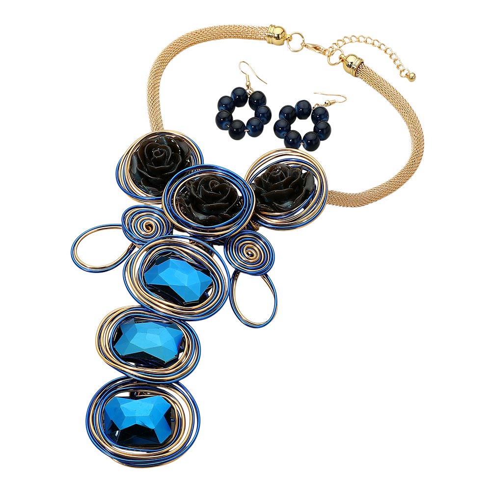 Details • Necklace Size : 19" + 3" L • Decor Size : 7" L • Earrings Size : 2" L • This bold statement necklace and earring set showcases an artistic blend of floral motifs and faceted gem accents. Designed to stand out, it adds dramatic elegance and creative flair to any outfit, making it the perfect accessory for special events or evening glamour. • Lead and Nickel Compliant