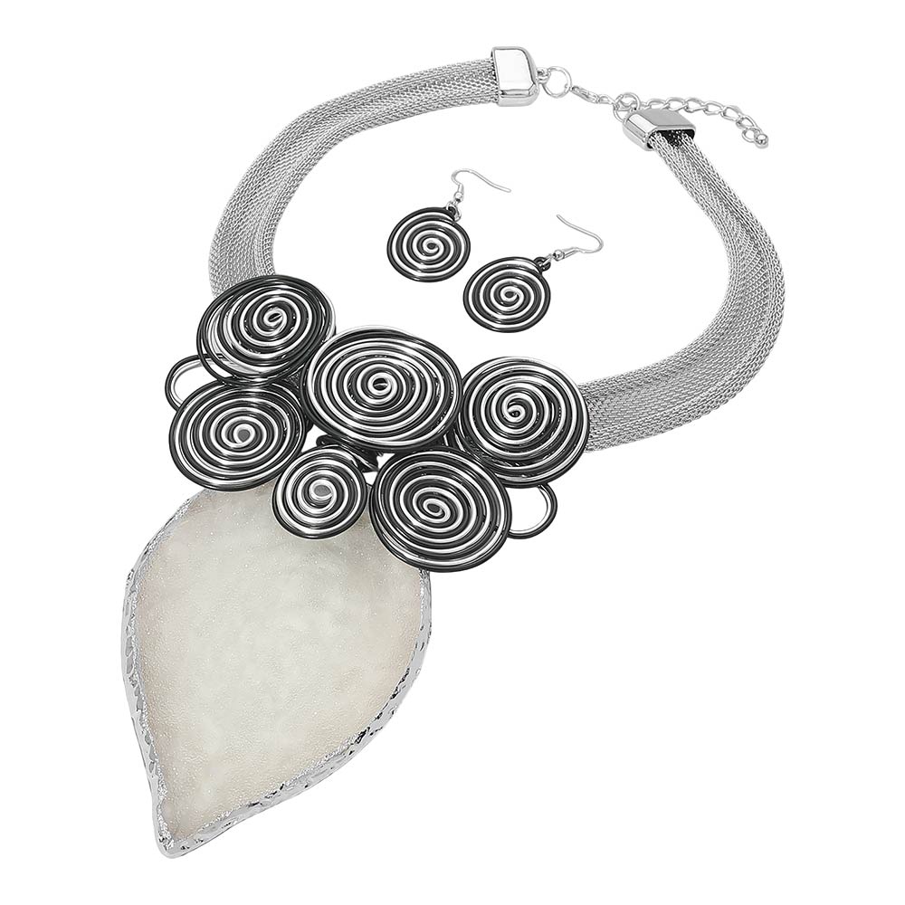 • This spiral pendant statement necklace set features layered circular wire accents paired with a bold centerpiece and coordinating drop earrings. Designed to create a modern artistic look, it adds strong visual impact and texture, making it ideal for boutiques seeking standout accessories for statement styling, special occasions, and elevated everyday outfits.
