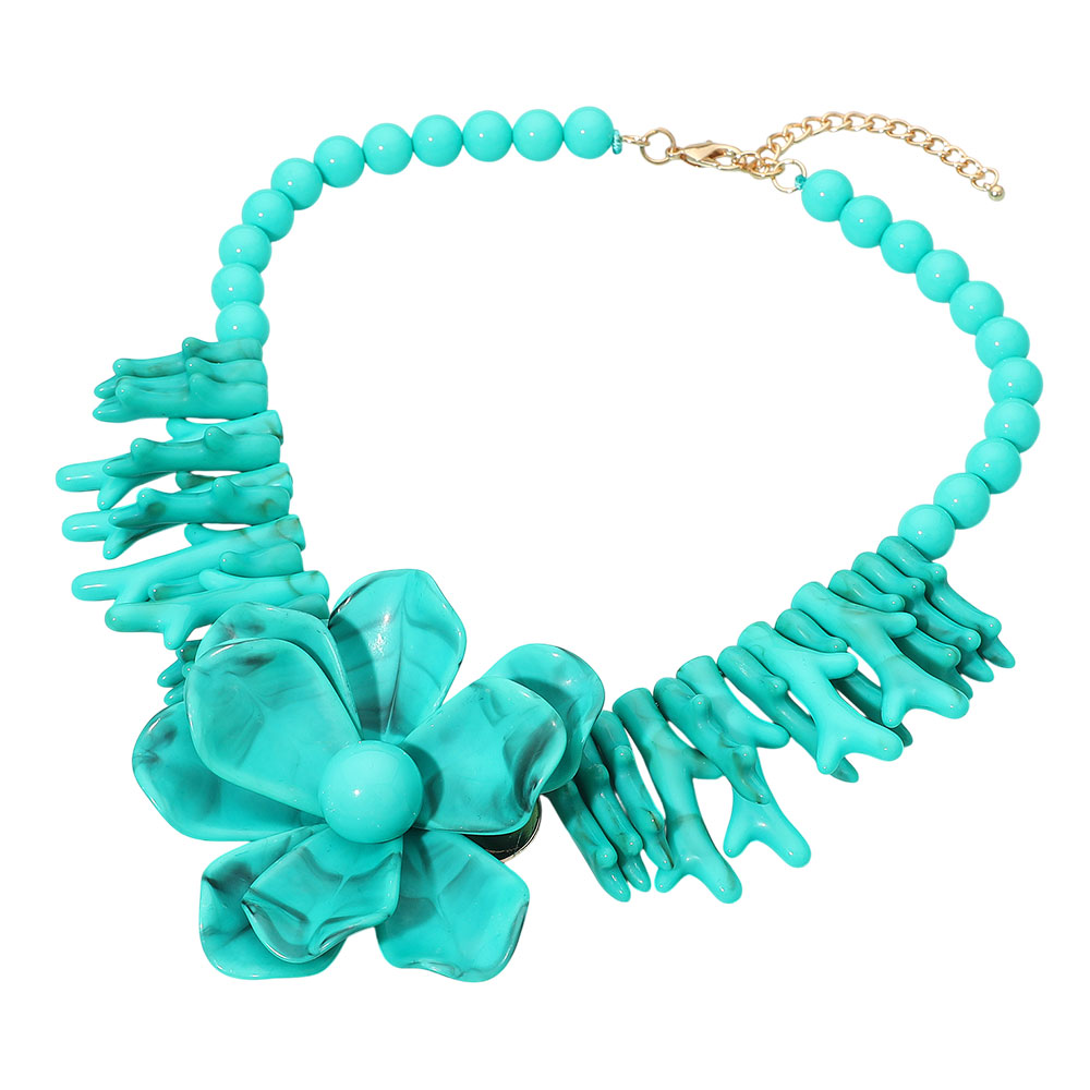 • Bold statement necklace showcasing a large sculpted flower centerpiece framed by coral-style accents and smooth round beads. Designed with an adjustable chain for a customizable fit, perfect for adding an artistic touch to any outfit.