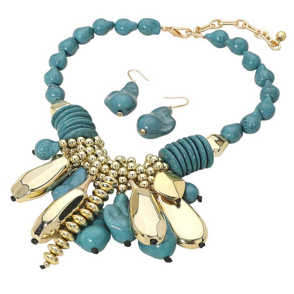 • This statement charm necklace and matching earring set features layered beads and sculptural accents for a bold, fashion-forward look. Designed to elevate boutique collections, it offers strong visual impact, versatile styling options, and standout appeal for trend-driven outfits and modern statement jewelry displays.