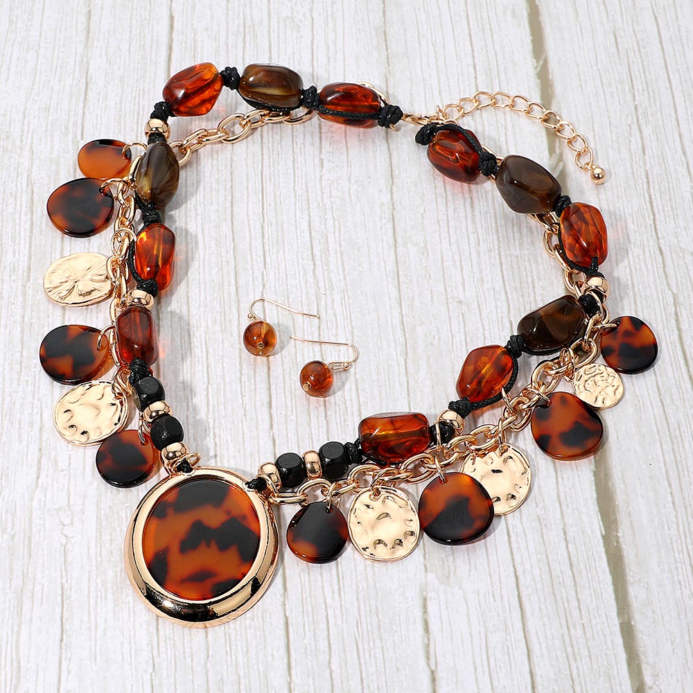 • Stand out with this layered charm necklace and earring set featuring a striking mix of patterned medallions, textured discs, and glossy beads. Its bold, fashion-forward design adds dynamic movement and rich detail, making it the perfect statement accessory for elevating any outfit with effortless flair.