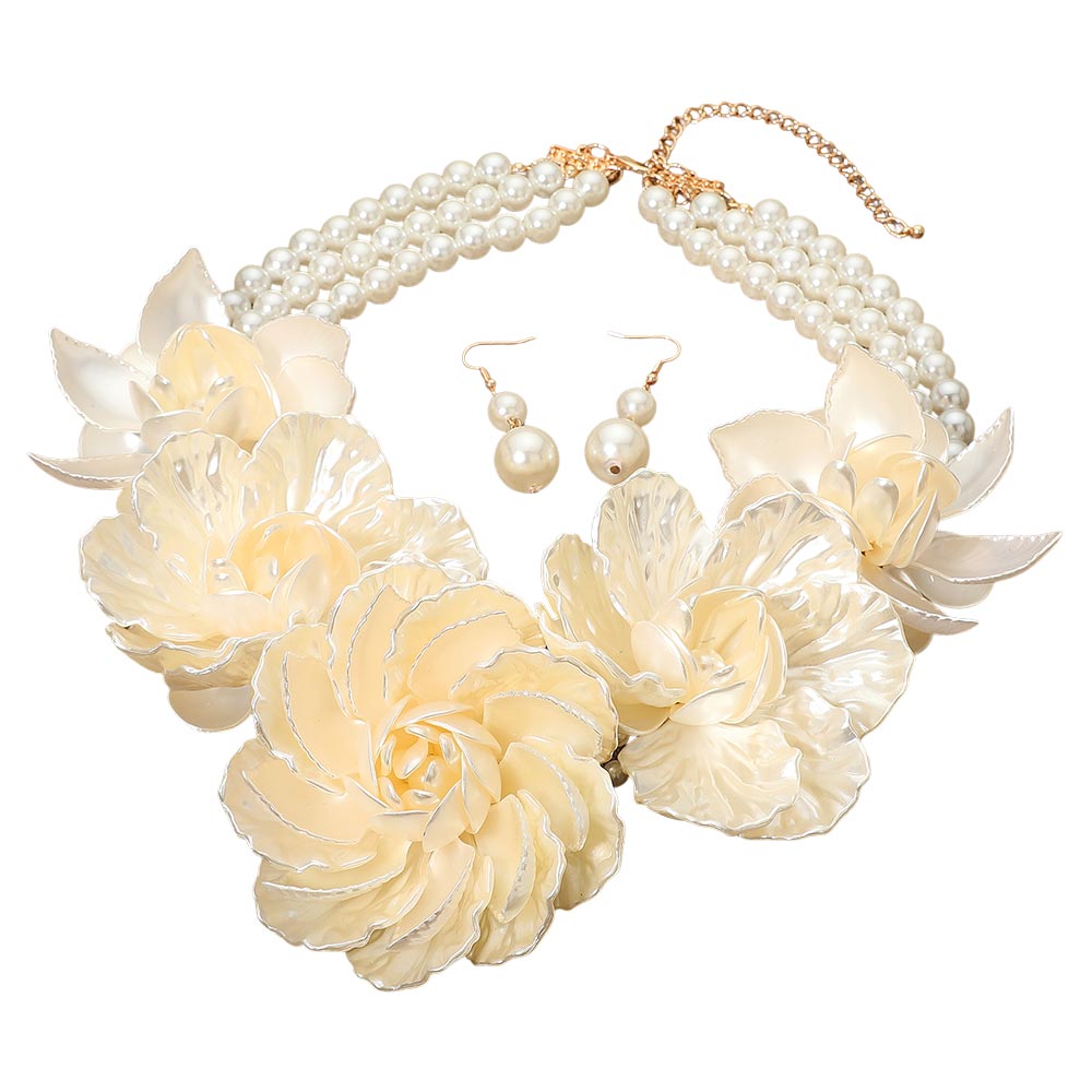 Bold Pearly Petal Floral Link Triple Pearl Strand Statement Necklace