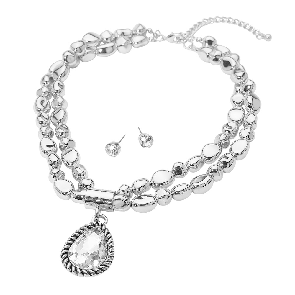 Bold Teardrop Pendant Metal Pebble Beaded Double Layered Statement Necklace