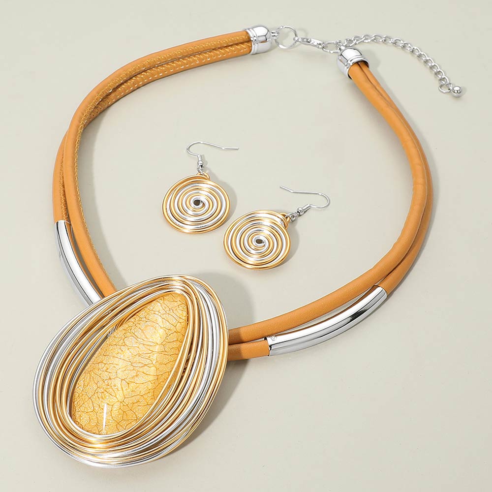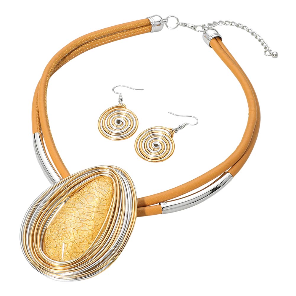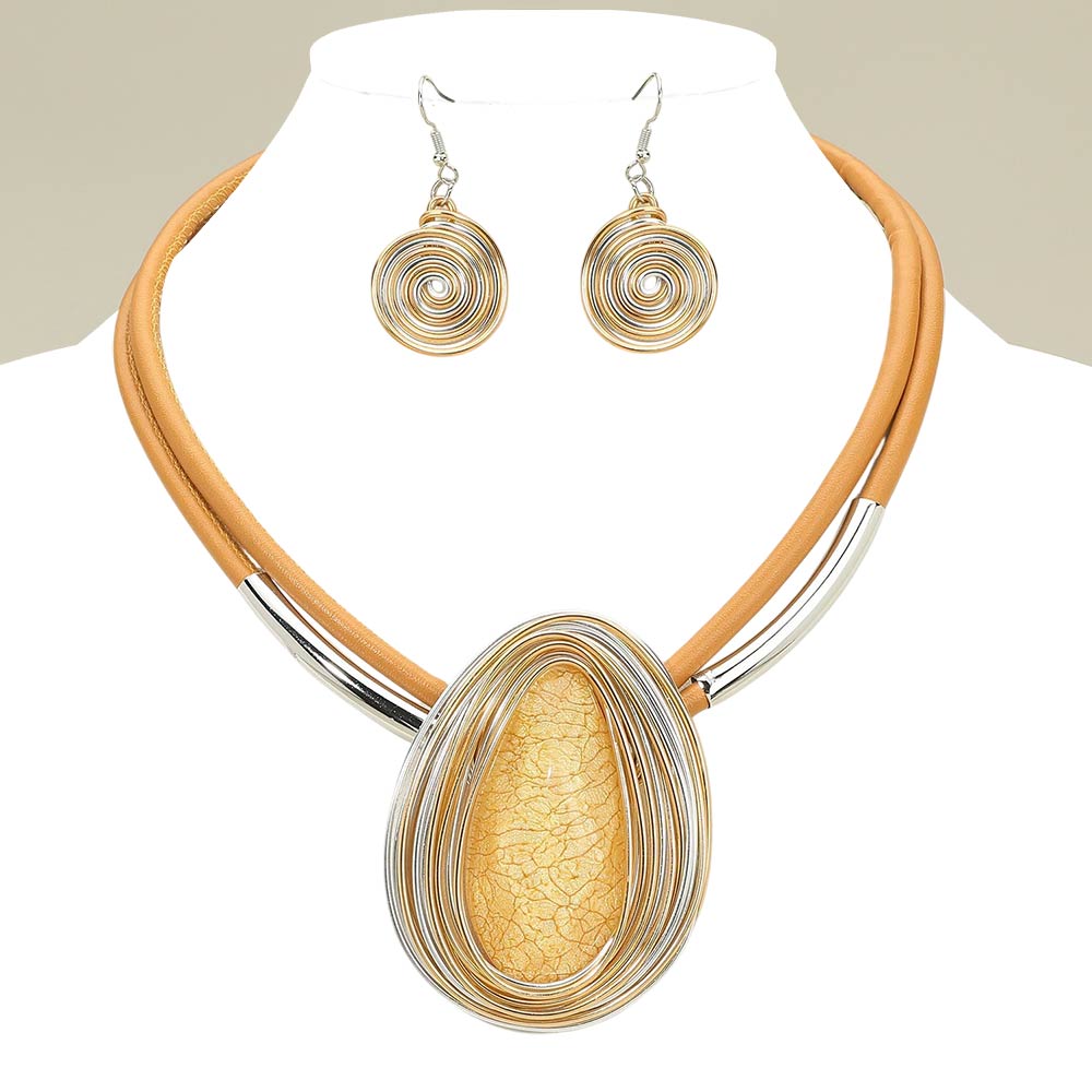 Bold Teardrop Stone Accent Spiral Wire Decor Layered Faux Leather Statement Necklace