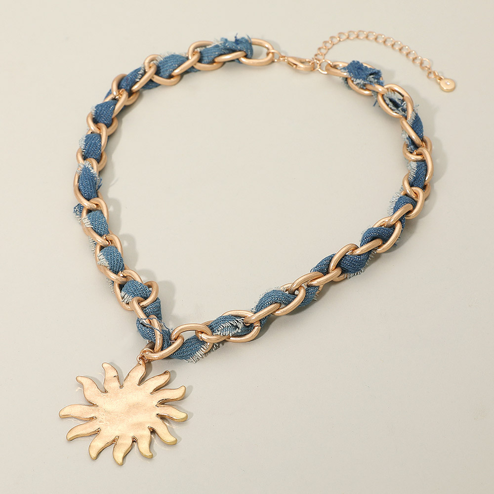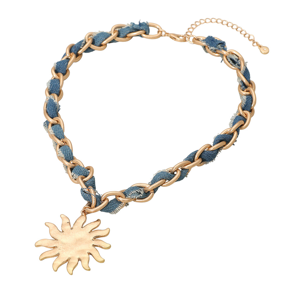 Brushed Hammered Metal Sun Pendant Denim Fabric Woven Chain Statement Necklace Brushed Hammered Metal Sun Pendant Denim Fabric Woven Chain Statement Necklace