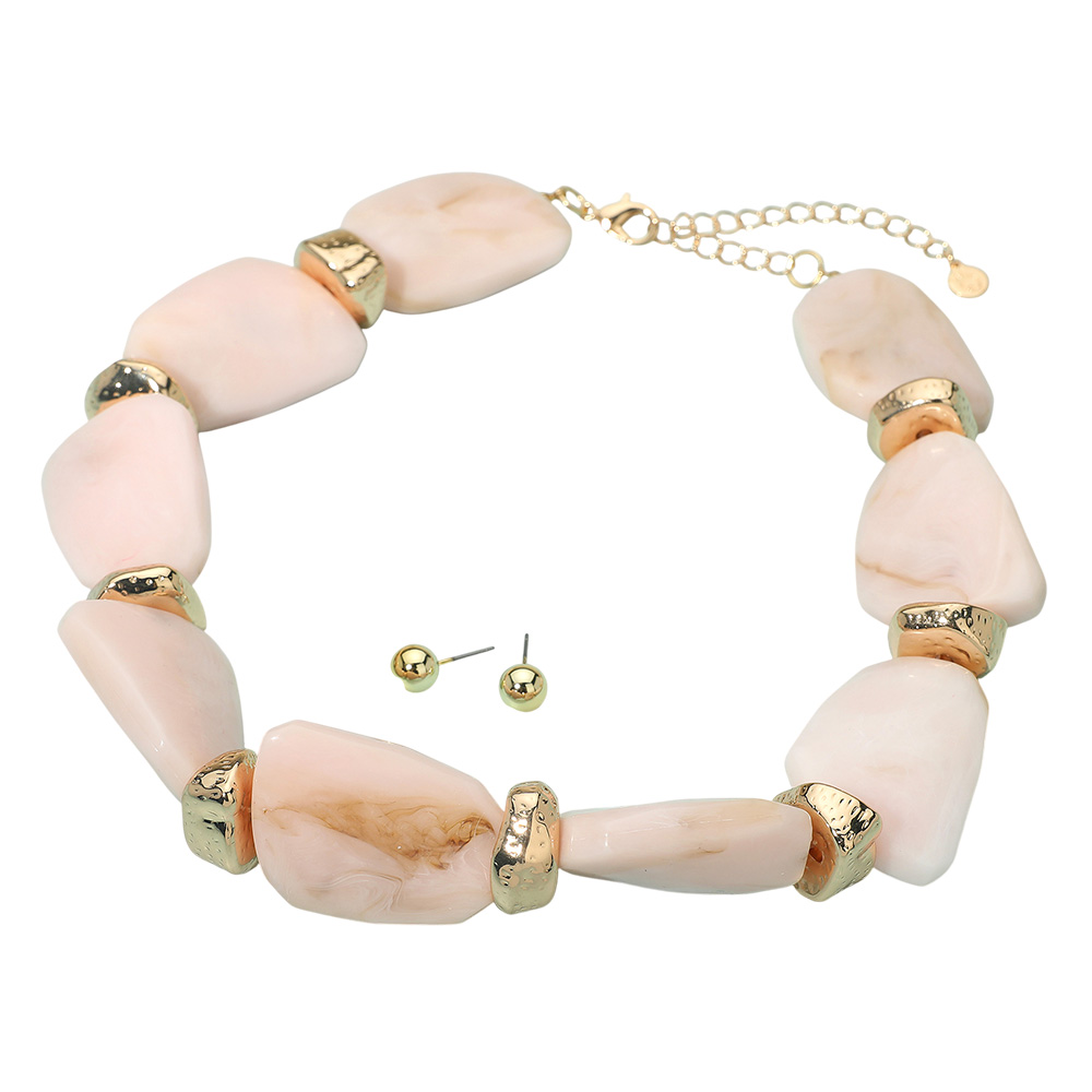 Details • Necklace Size : 17" + 3.25" L • Decor Size : 1.2" L • Earrings Size : 0.25" L • Make a striking impression with a chunky stone necklace set featuring oversized natural-shaped beads and matching stud earrings. Perfect for special occasions or elevating everyday looks, this bold accessory combines earthy elegance with contemporary flair. • Lead and Nickel Compliant