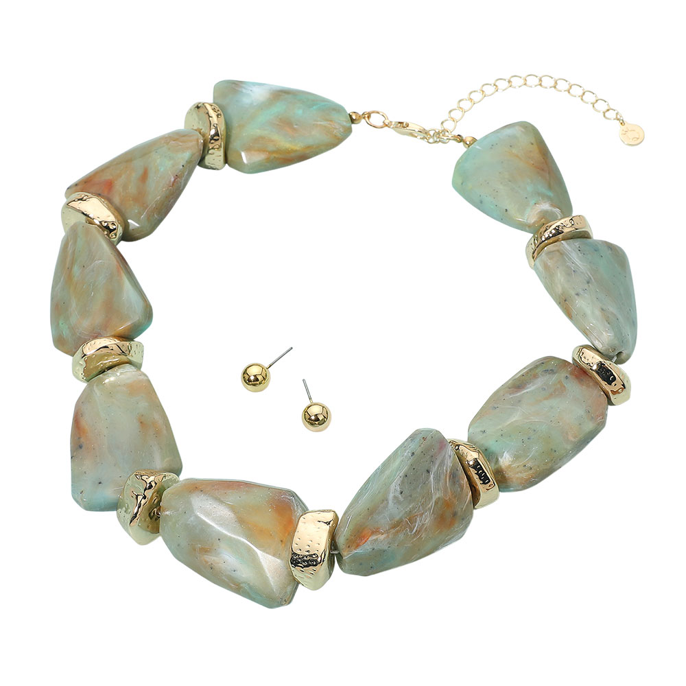 Details • Necklace Size : 17" + 3.25" L • Decor Size : 1.2" L • Earrings Size : 0.25" L • Make a striking impression with a chunky stone necklace set featuring oversized natural-shaped beads and matching stud earrings. Perfect for special occasions or elevating everyday looks, this bold accessory combines earthy elegance with contemporary flair. • Lead and Nickel Compliant