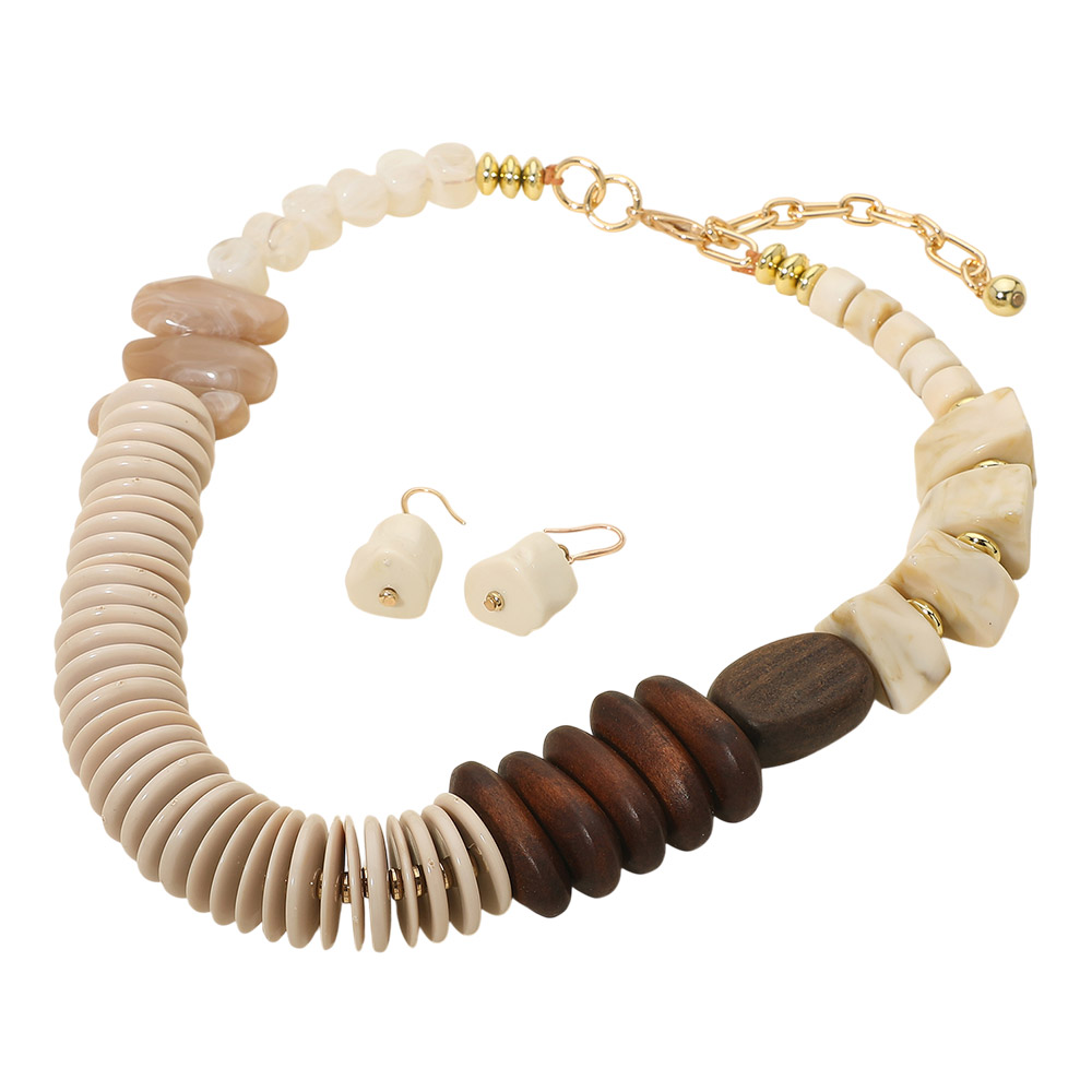 Details • Necklace Size : 22.5" + 3.5" L • Decor Size : 1.3" L • Earrings Size : 1.5" L • Statement necklace and matching earring set featuring bold, mixed bead shapes arranged in a balanced, eye-catching design. This coordinated set delivers a modern statement look that elevates casual outfits and resort-inspired styling. Ideal for boutiques seeking unique, fashion-forward jewelry sets that add texture, dimension, and visual impact to curated accessory collections. • Lead and Nickel Compliant
