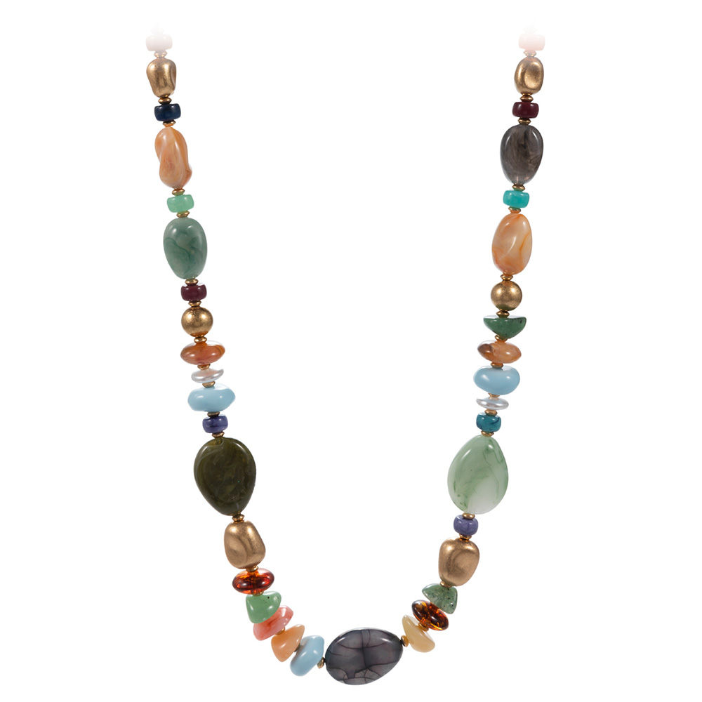 Details • Necklace Size : 18.5" + 3.5" L • Decor Size : 0.75" L • Add a playful touch to your look with this colorful beaded necklace featuring mixed shapes and polished finishes. Perfect for layering or wearing solo, this boho-inspired statement piece enhances casual outfits, parties, or special occasions with vibrant style. • Lead and Nickel Compliant