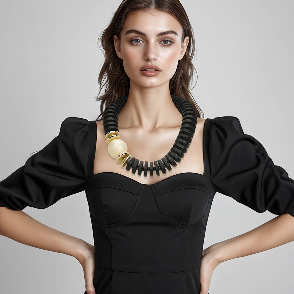 Details • Necklace Size : 22" + 1" L • Decor Size : 1.5" L • Bold statement necklace featuring stacked disc beads and a sculptural focal accent for a modern, high-impact look. Designed to add structure and dimension to any outfit, this piece works effortlessly for everyday styling or elevated occasions. A standout accessory ideal for boutiques seeking fashion-forward, trend-driven statement jewelry. • Lead and Nickel Compliant