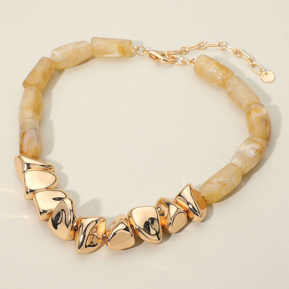 • Bold and modern chunky beaded necklace featuring polished metal accents paired with smooth marbled beads. Designed with an adjustable clasp for comfort, this necklace brings a touch of natural elegance and contemporary style to any jewelry collection.