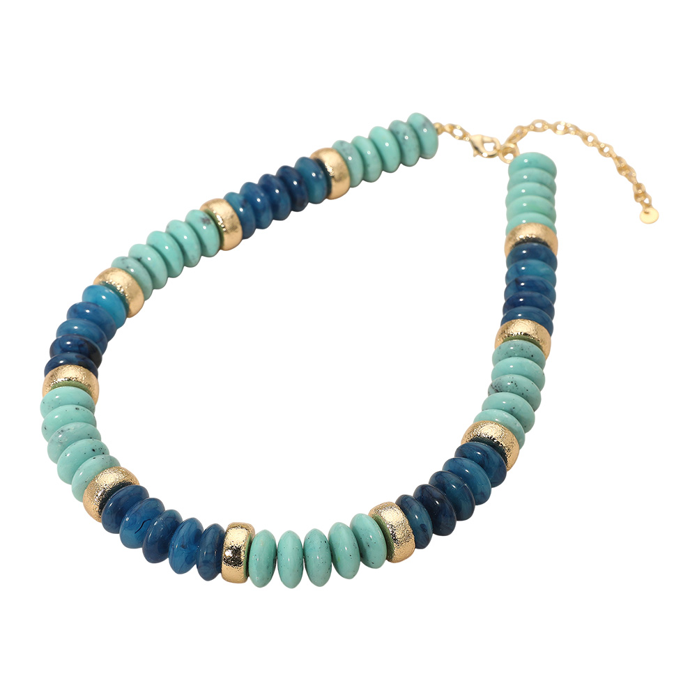 • Bold and contemporary, this chunky beaded necklace features smooth disc-shaped beads with metallic gold-tone spacers. A versatile statement piece that elevates any outfit with its sleek, modern design.