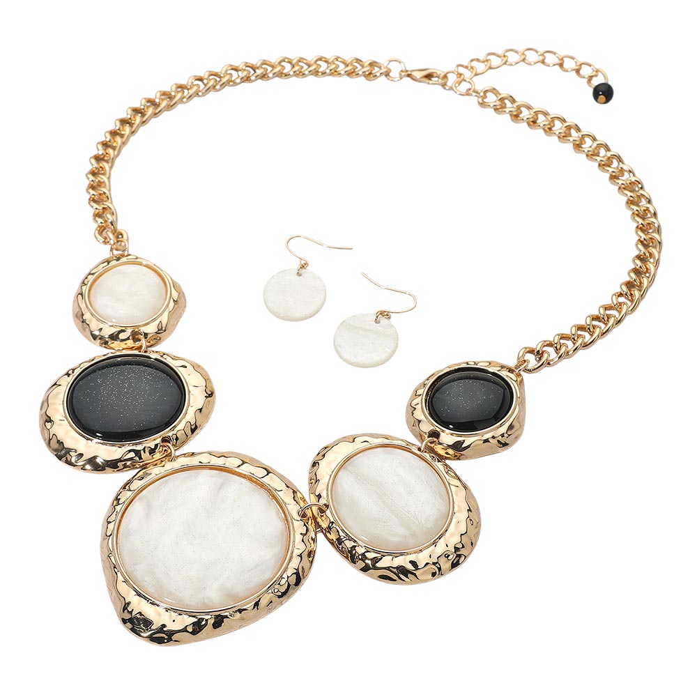 • Turn heads with this bold round pendant necklace set featuring textured metal frames and matching earrings. The unique circular design adds a dramatic flair, perfect for stylish evenings or standout occasions.