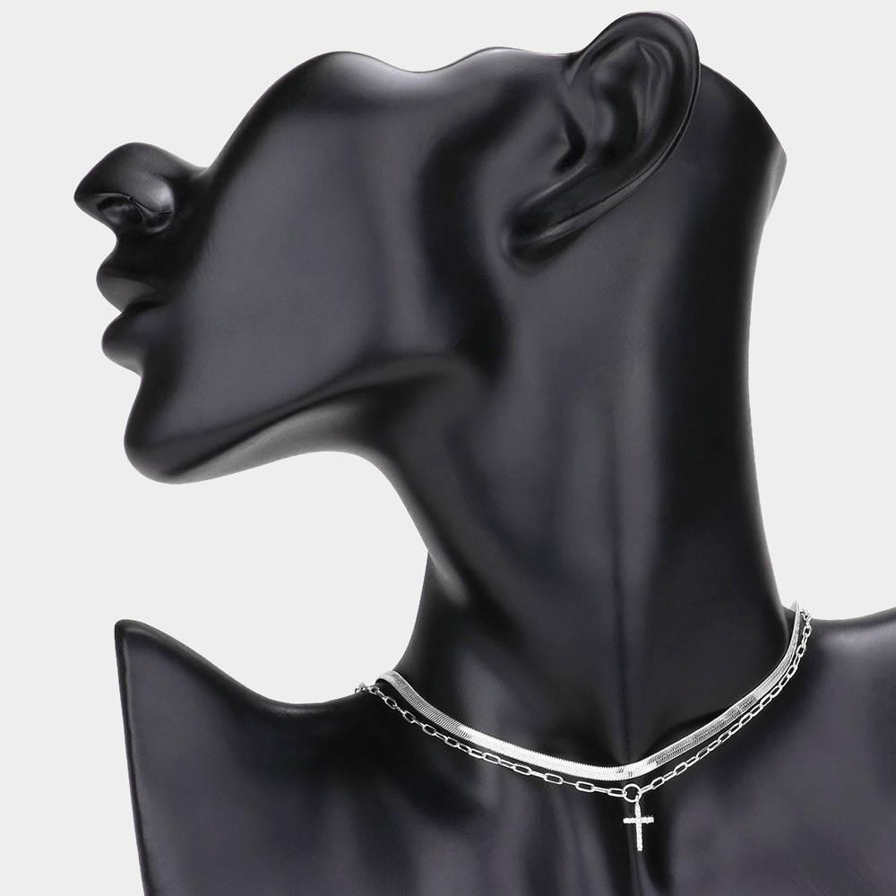 CZ Brass Metal Cross Pendant Double Layered Necklace