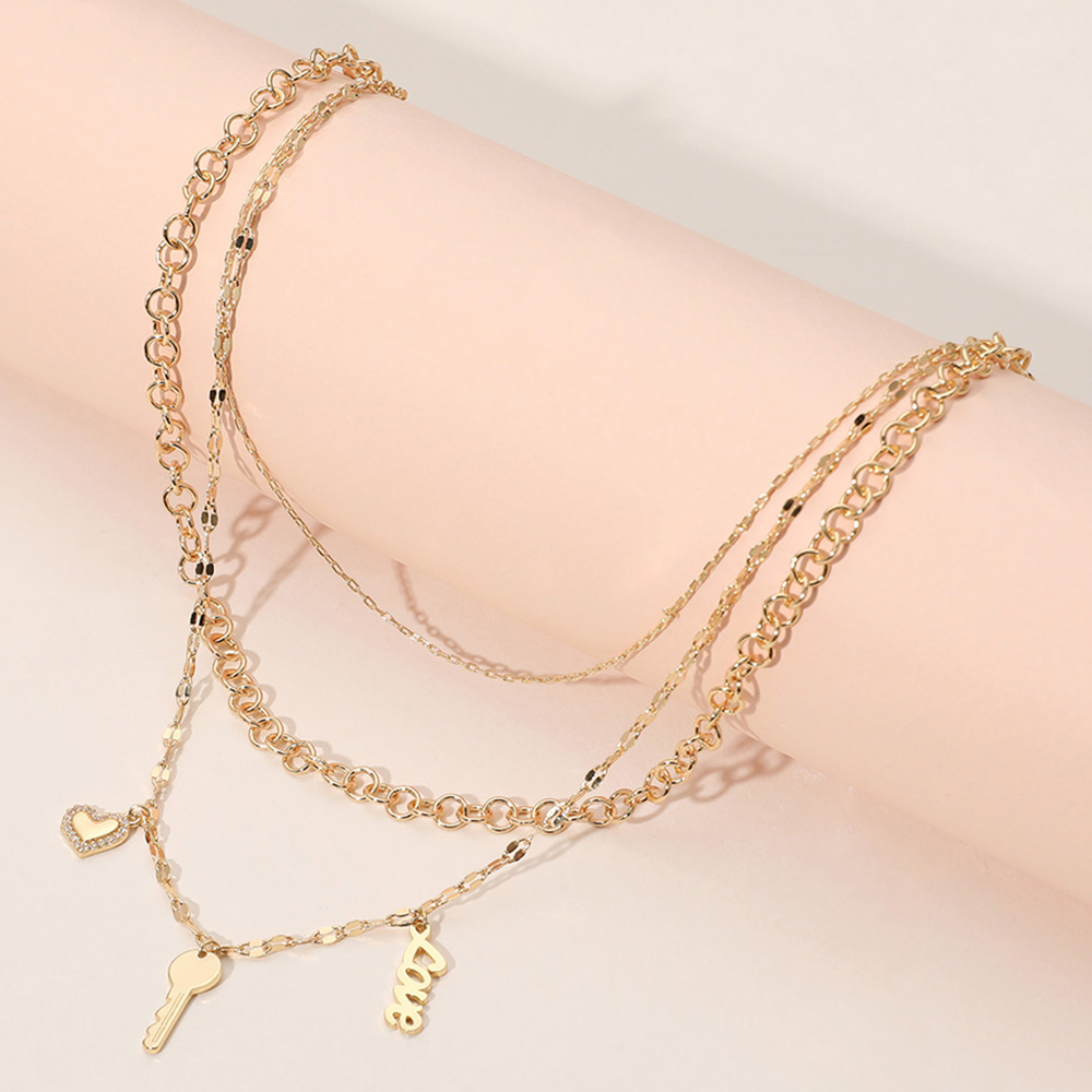 CZ Stone Paved Heart Brass Metal Key LOVE Charm Layered Necklace