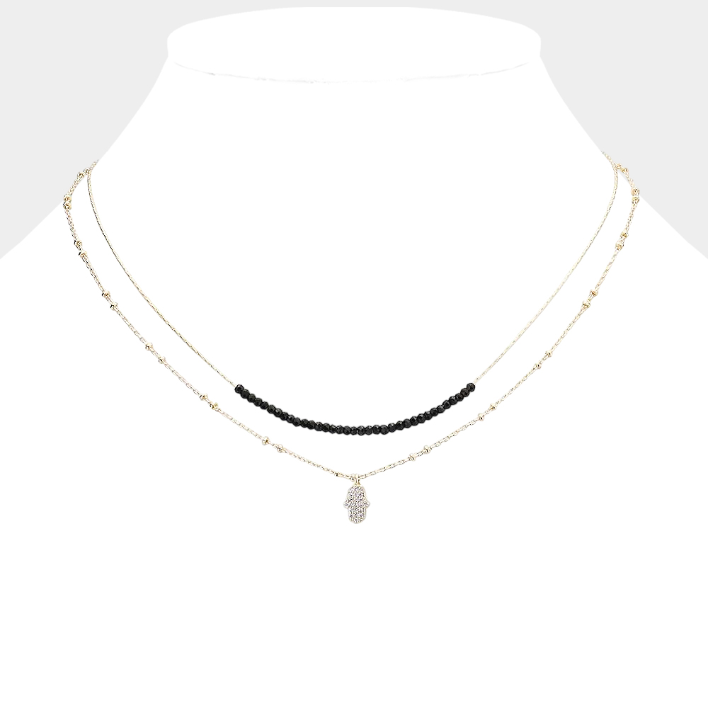 Rhinestone Embellished Hamsa Hand Freshwater Pearl Link Double Layered Necklace