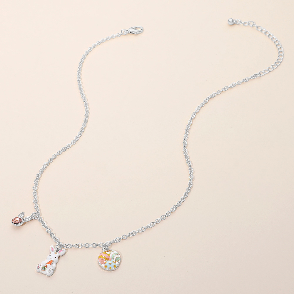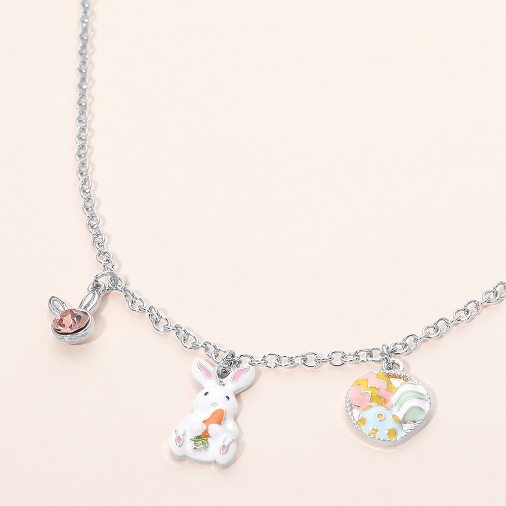 Details • Necklace Size : 18" + 3.25" L • Decor Size : 0.75" L • Easter bunny charm necklace featuring playful seasonal motifs designed to bring cheerful character to spring styling. A fun statement piece ideal for holiday outfits, gifting, or themed displays. Perfect for boutiques seeking festive jewelry that adds charm, personality, and seasonal appeal. • Lead and Nickel Compliant