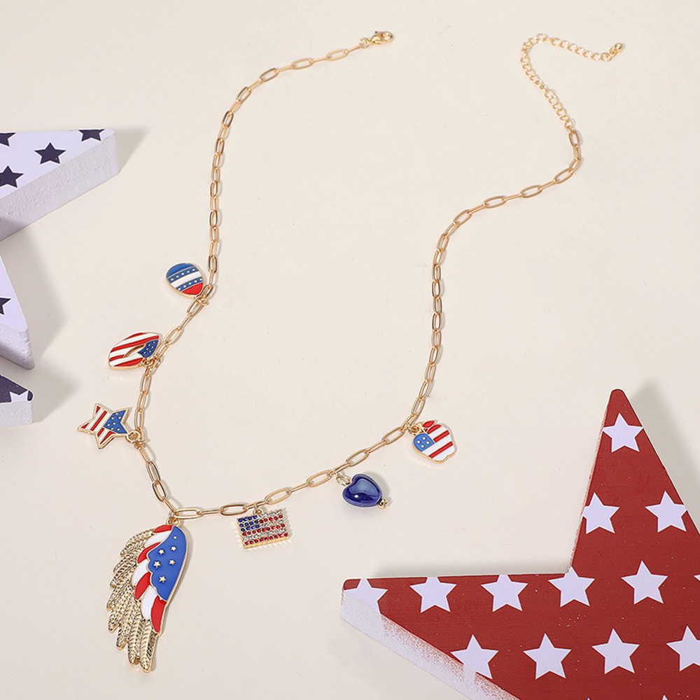 Enamel American USA Flag Wing Star Egg Heart Lips Apple Charm Station Paperclip Chain Necklace