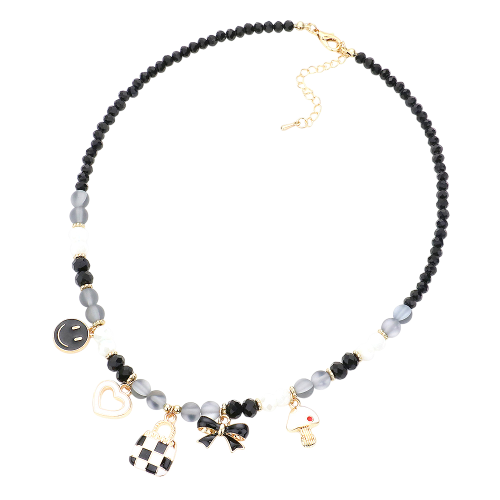 Enamel Smile Heart Tote Bag Bow Mushroom Pendant Station Beaded Necklace