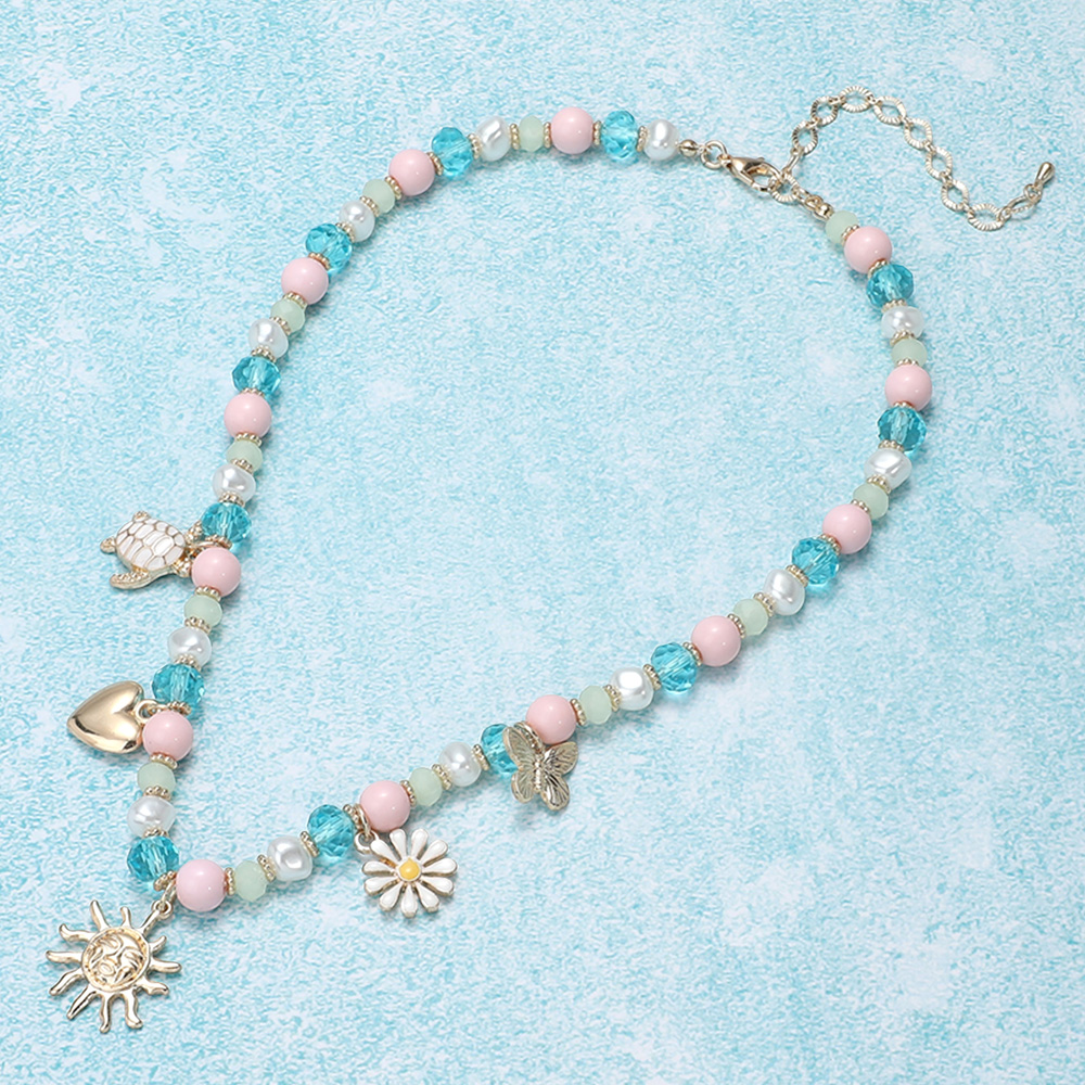 Enamel Turtle Flower Metal Heart Sun Butterfly Charm Station Pearl Faceted Beaded Necklace