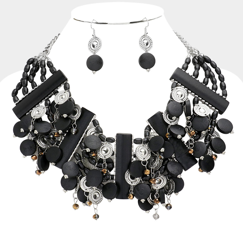 Chunky Pearl Wooden Cube Metal Pebble Accent Multi Disc Beaded Layered Toggle Statement Necklace