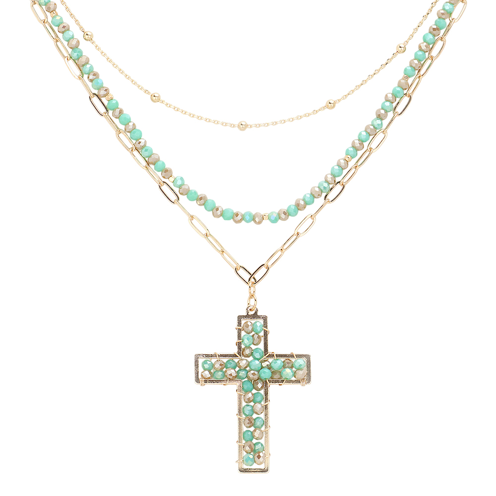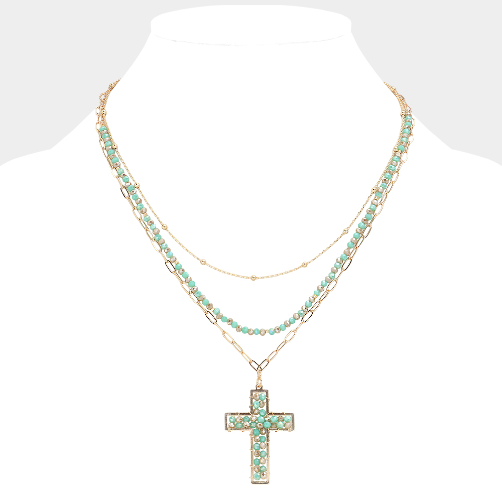 Faceted Beaded Metal Paperclip Chain Layered Cross Pendant Necklace