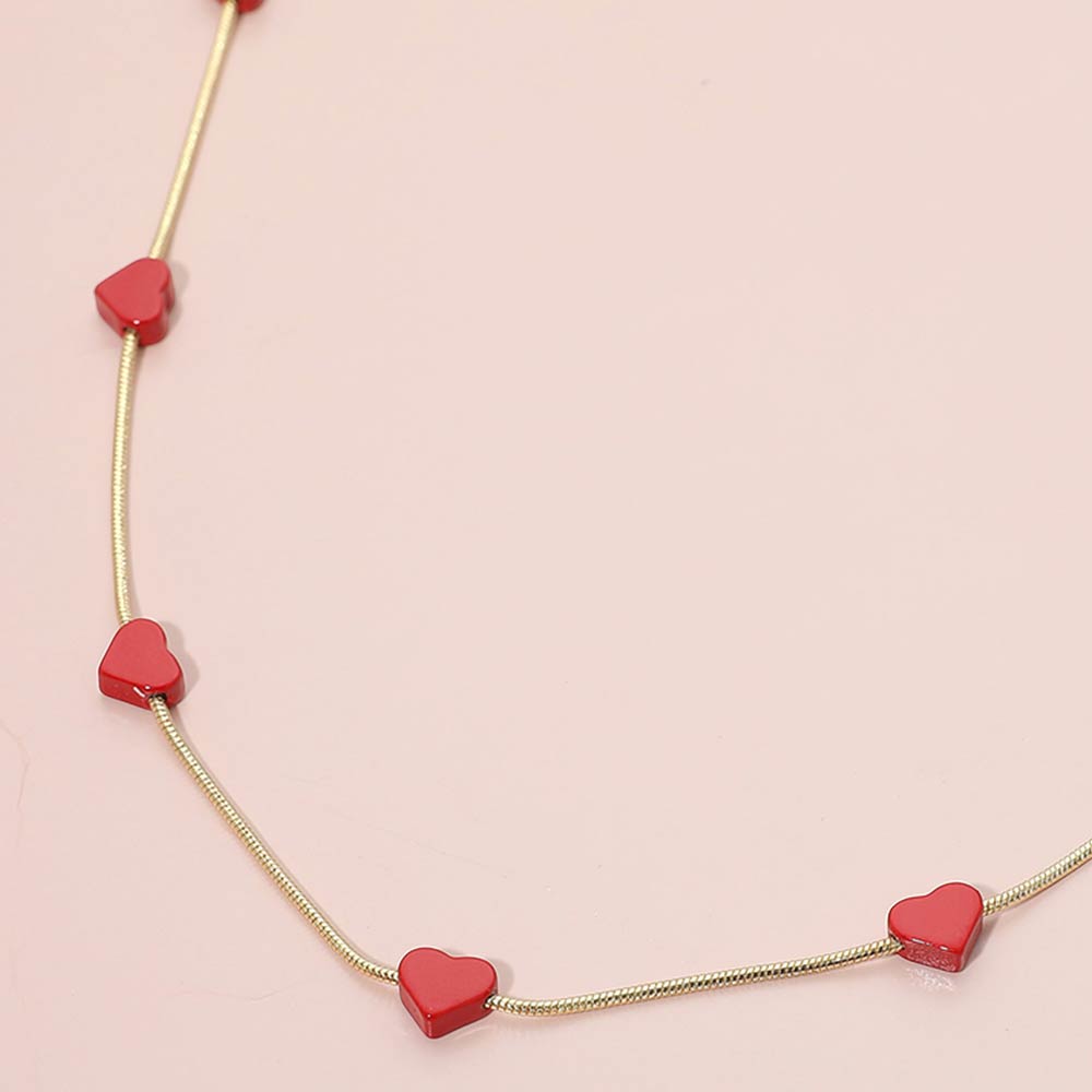 Details • Necklace Size : 16" + 2.25" L • Decor Size : 0.25" L • This heart station necklace features evenly spaced heart accents along a smooth, flexible chain for a balanced and feminine look. Designed for easy layering or standalone wear, it adds charm to everyday outfits, special occasions, and gift assortments, making it a versatile choice for boutique jewelry collections. • Lead and Nickel Compliant