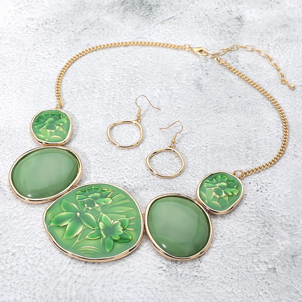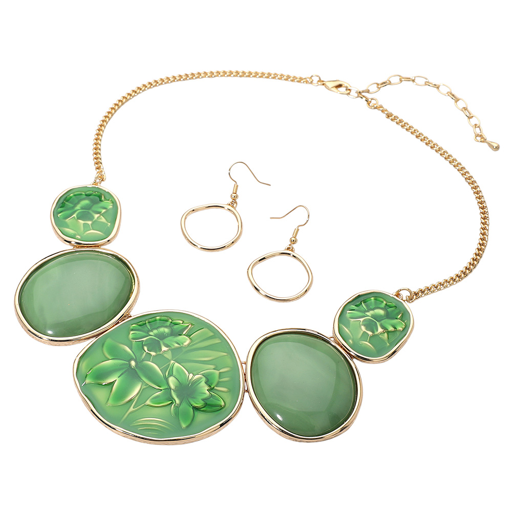 • Elegant statement necklace and earrings set featuring embossed floral designs on smooth, polished oval accents. The sculpted flowers and glossy finish add a touch of sophistication, perfect for enhancing formal outfits or making a bold fashion statement.