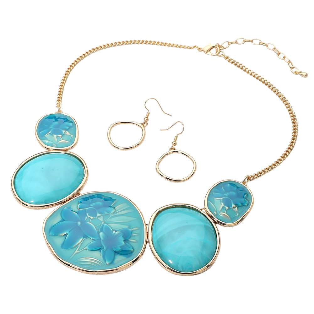 • Elegant statement necklace and earrings set featuring embossed floral designs on smooth, polished oval accents. The sculpted flowers and glossy finish add a touch of sophistication, perfect for enhancing formal outfits or making a bold fashion statement.
