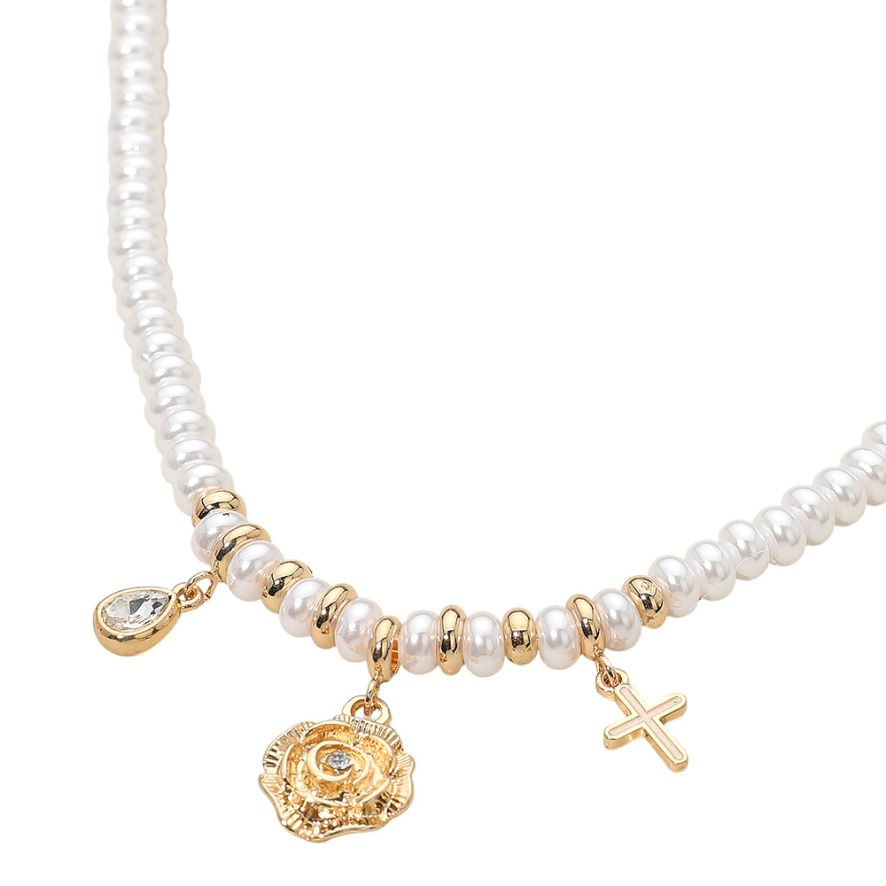 • This elegant charm pearl necklace features a string of lustrous beads accented by delicate pendants, including a floral medallion, teardrop crystal, and cross. Designed for timeless sophistication, it enhances both casual and formal looks with refined elegance.