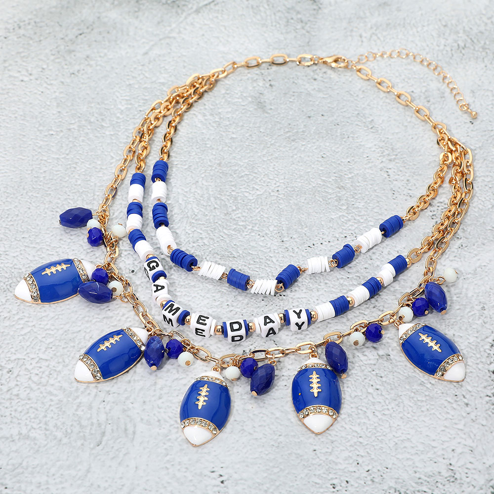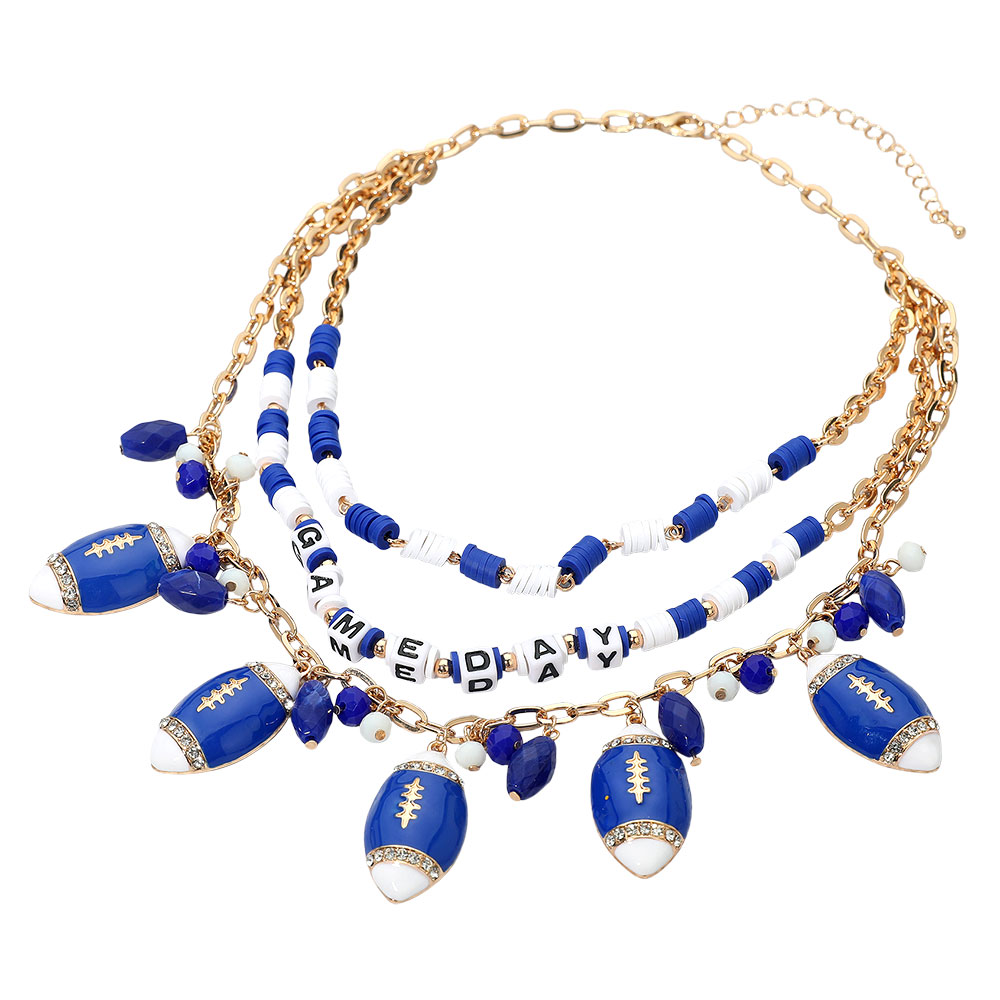 Details • Necklace Size : 16.5" + 3" L • Decor Size : 3.5" L • Layered necklace featuring football charms, gameday letter beads, and playful accents. A spirited accessory to show team pride, add energy to gameday looks, and complete fan outfits with fun layered style. • Lead and Nickel Compliant