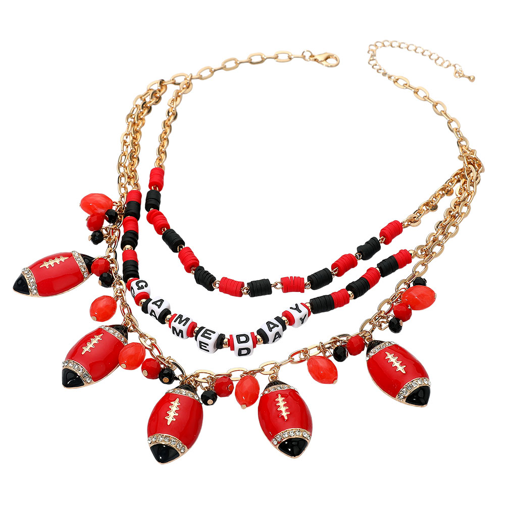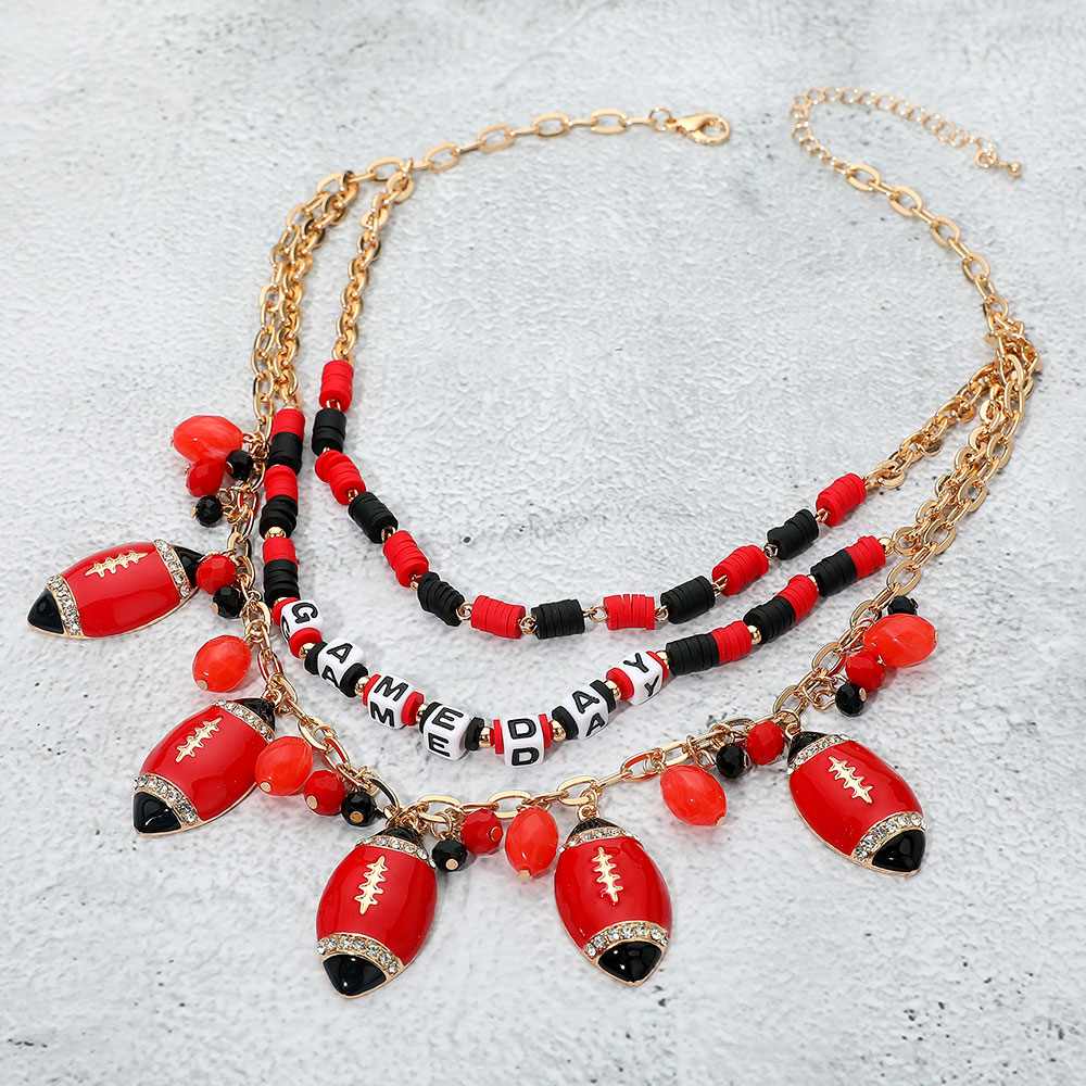Details • Necklace Size : 16.5" + 3" L • Decor Size : 3.5" L • Layered necklace featuring football charms, gameday letter beads, and playful accents. A spirited accessory to show team pride, add energy to gameday looks, and complete fan outfits with fun layered style. • Lead and Nickel Compliant