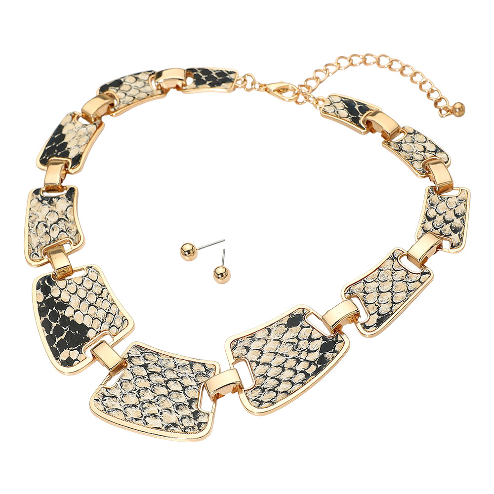 Details • Necklace Size : 17" + 3" L • Decor Size : 1.25" L • Earrings Size : 0.25" L • Make a bold impression with this statement necklace featuring wide linked panels in a striking snakeskin pattern. Designed to elevate any outfit, it comes with matching stud earrings for a complete look. Perfect for parties, evening events, or adding a dramatic edge to everyday style. • Lead and Nickel Compliant