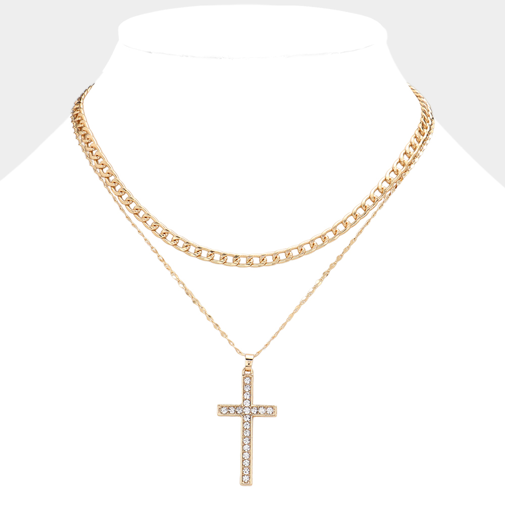 Gold Dipped Stone Paved Cross Pendant Cuban Chain Layered Necklace