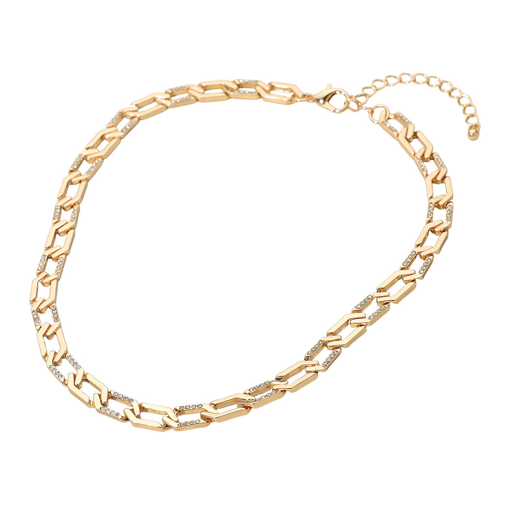 Details • Necklace Size : 16.5" + 3" L • Decor Size : 0.3" L • Stylish geometric chain link necklace adorned with sparkling crystal accents for a modern and elegant look. Adjustable design makes it perfect for layering or wearing solo, adding a chic statement to any outfit. • Lead and Nickel Compliant • Gold Dipped