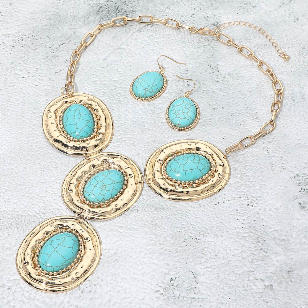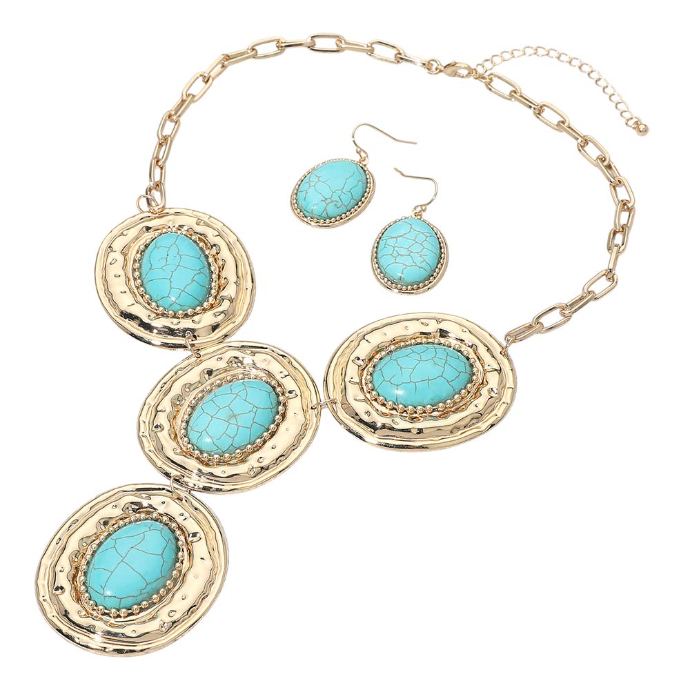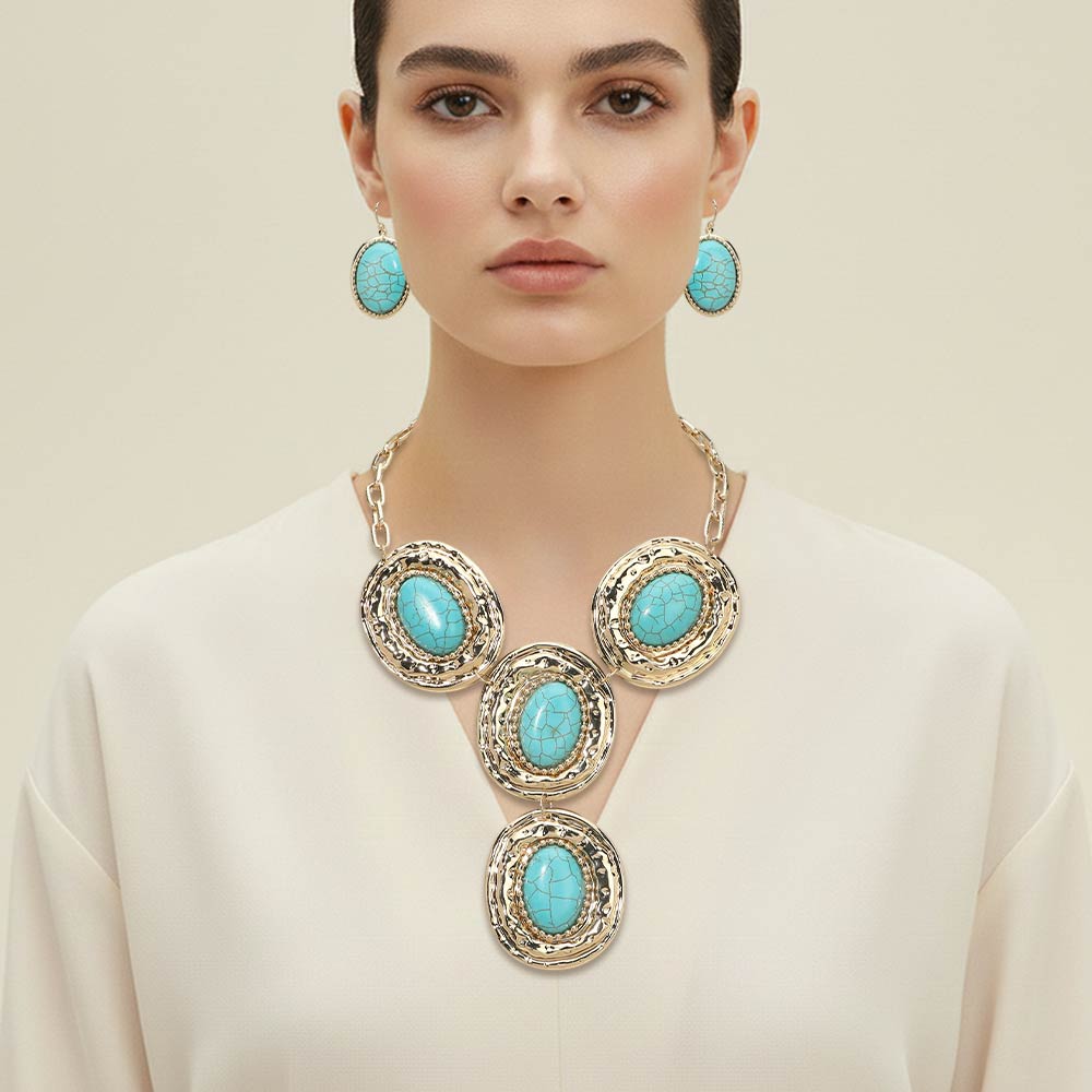 Details • Necklace Size : 18" + 3.25" L • Decor Size : 4.1" L • Earrings Size : 1.7" L • Statement necklace and matching earring set featuring bold oval accents with a textured, dimensional design. This coordinated jewelry set delivers a striking focal point for dressy occasions and elevated everyday looks. Ideal for boutiques seeking eye-catching statement pieces that offer balance, structure, and modern appeal while pairing easily with a variety of outfits and styling themes. • Lead and Nickel Compliant