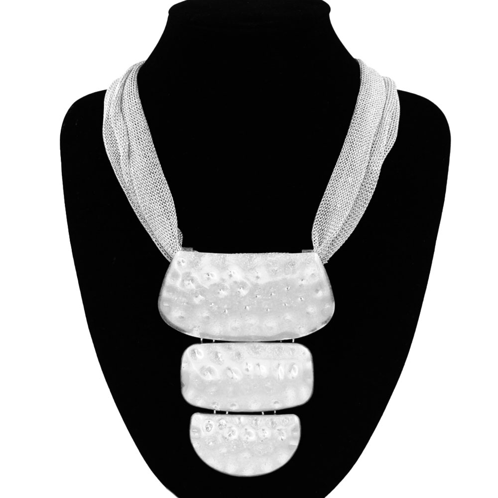 Details • Size : 20" + 3"L • Decor Size : 4" L • Elevate your look with the Hammered Geometric Metal Pendant Mesh Fabric Necklace, featuring sculpted metallic pendant. This striking statement piece blends artistic texture with modern elegance, perfect for enhancing both formal and fashion-forward outfits. • Lead and Nickel Compliant